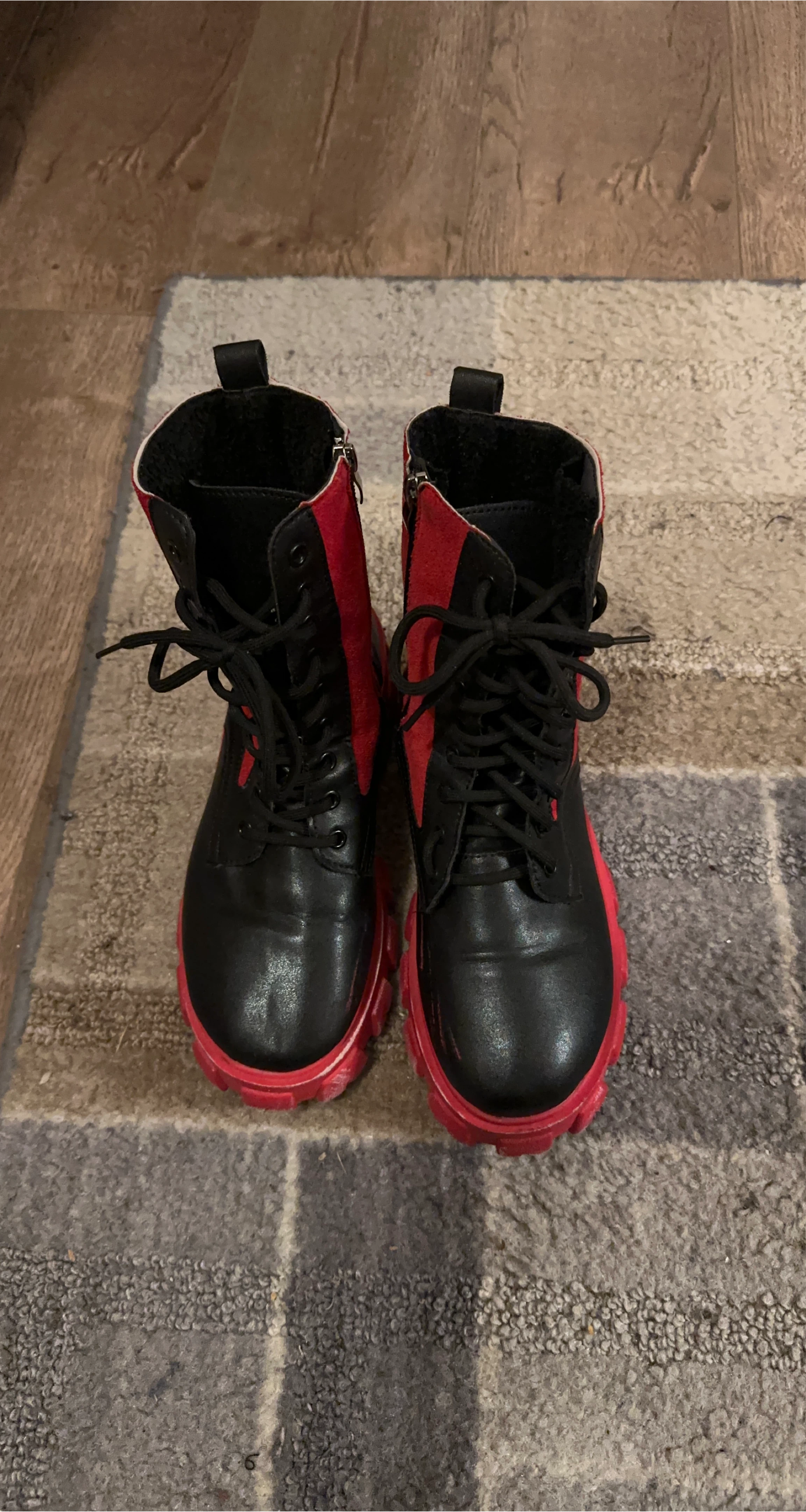 Selling a pair of lace-up boots with a unique red and black colour combination. They're in good condition and ready for a new home. Size 6