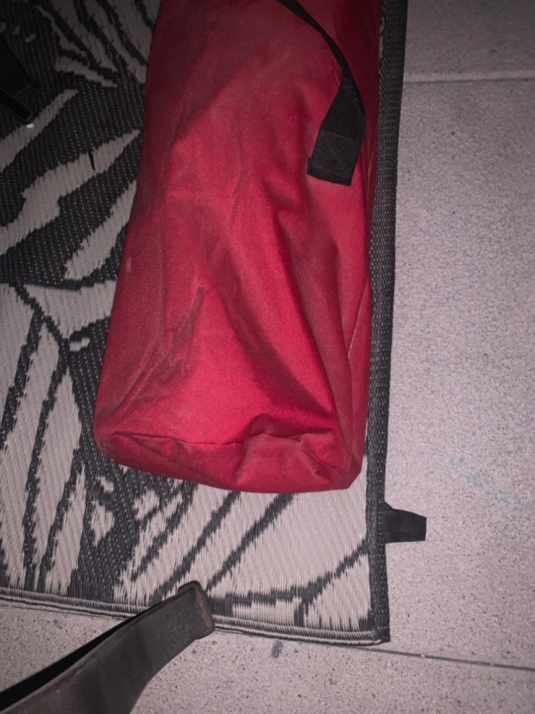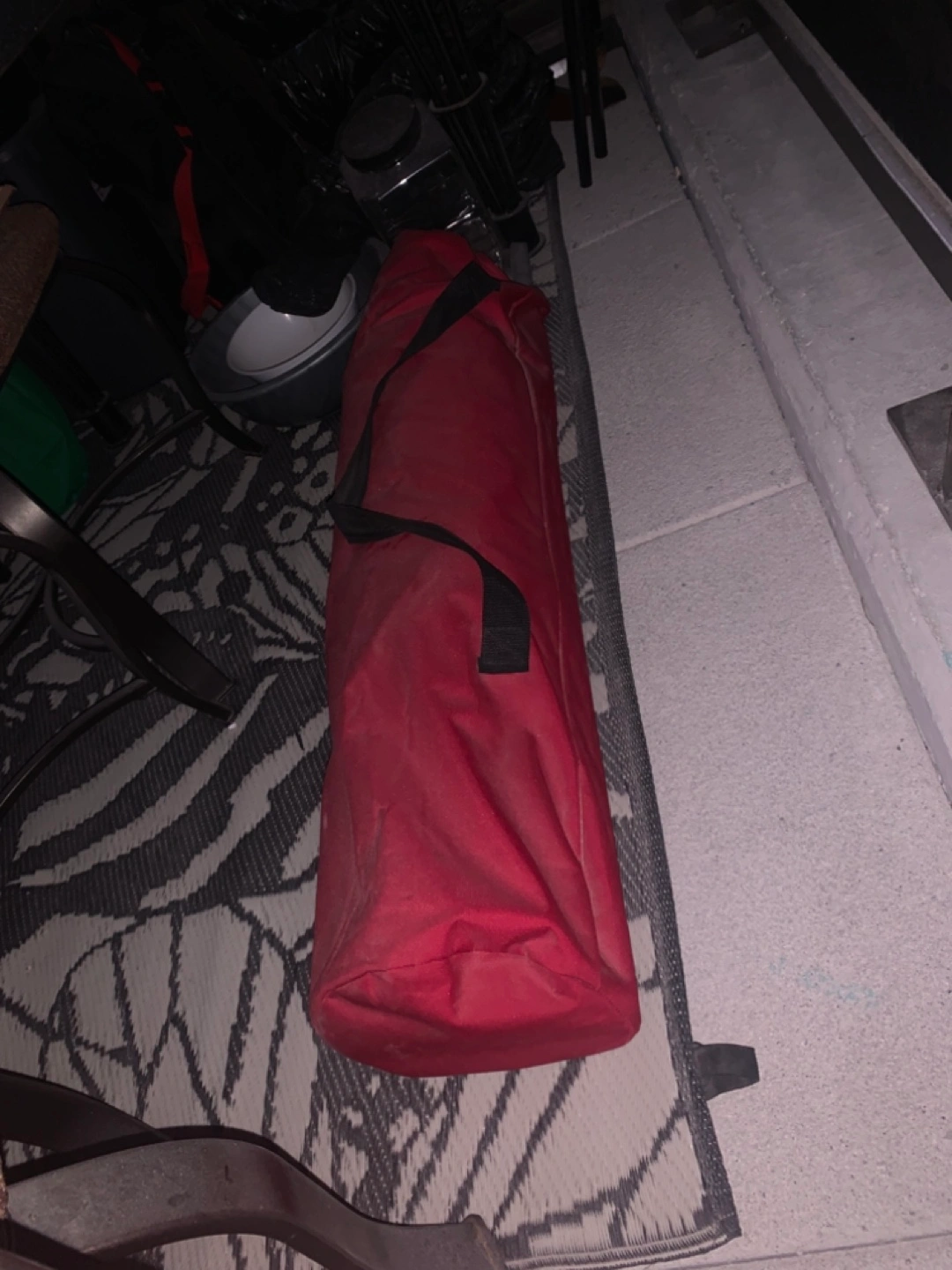 Red cylindrical carry bag. for camping/outdoor or even for unexpected visitor equipment. Durable fabric construction. Features a carrying handle and super easy to set up while sturdy and very strong framework.. holds 500 lbs and is 39.5”W x82”L x 22”H.