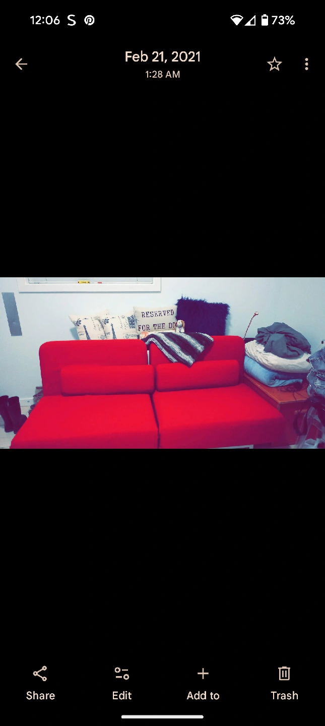 Selling a red convertible sofa bed. It's in good condition and can be used as a sofa or unfolded into a bed. Perfect for small spaces or a guest room! Mint condition. Only used by adults - Never sat on by children or pets. Very clean. been in storage for last 3 years.