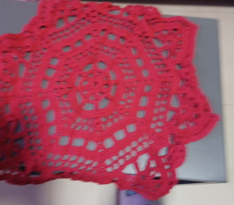 Here's a pretty red crocheted doily! It's in good condition and would look great on a table or shelf