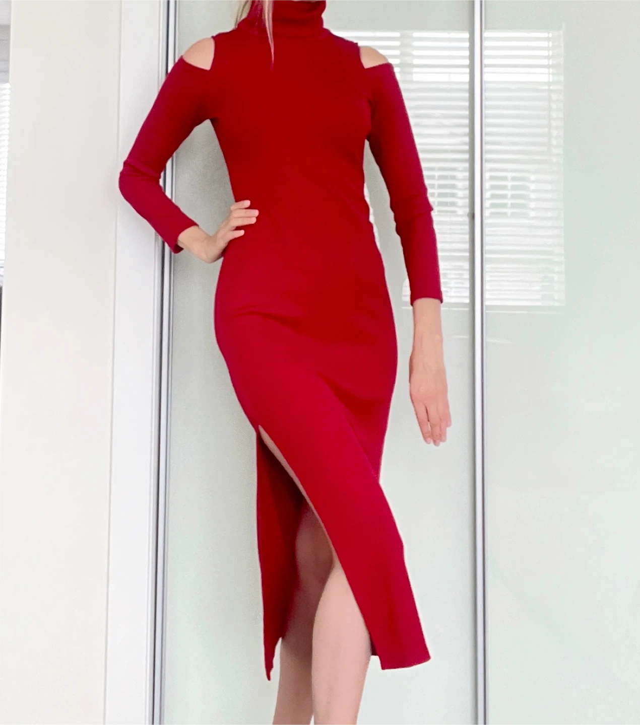 A stylish red midi dress with cutout shoulders. This dress features a turtleneck and a side slit, perfect for a chic and modern look. It's in great condition and ready for a new home!