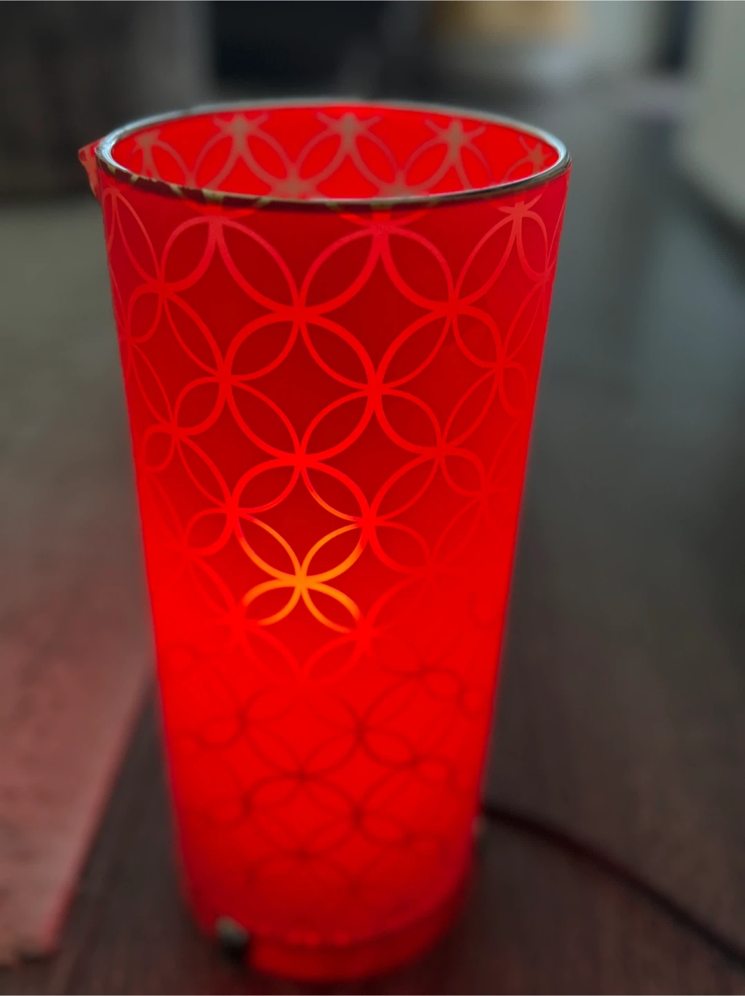 Here's a vibrant red accent lamp to brighten up any room! It features a unique geometric pattern and a warm, inviting glow. Perfect for adding a touch of modern style to your home decor