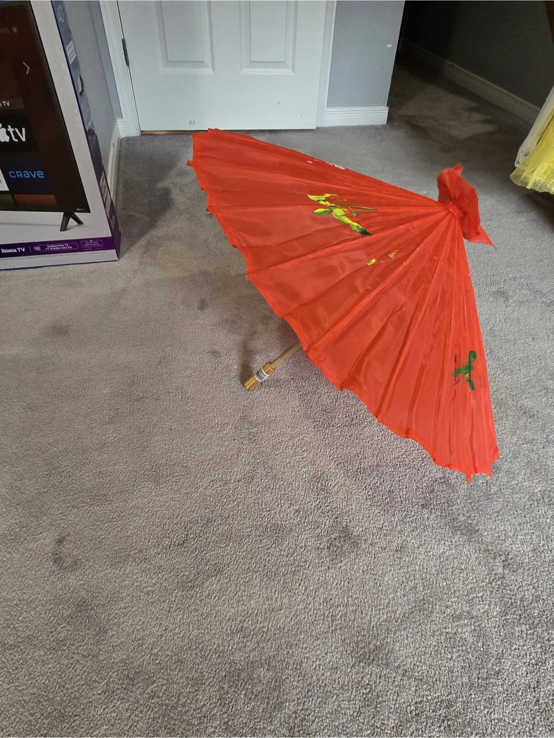 Selling a red decorative parasol, perfect for adding a touch of flair to any room or used for costume. It's in good condition and ready for a new home.
