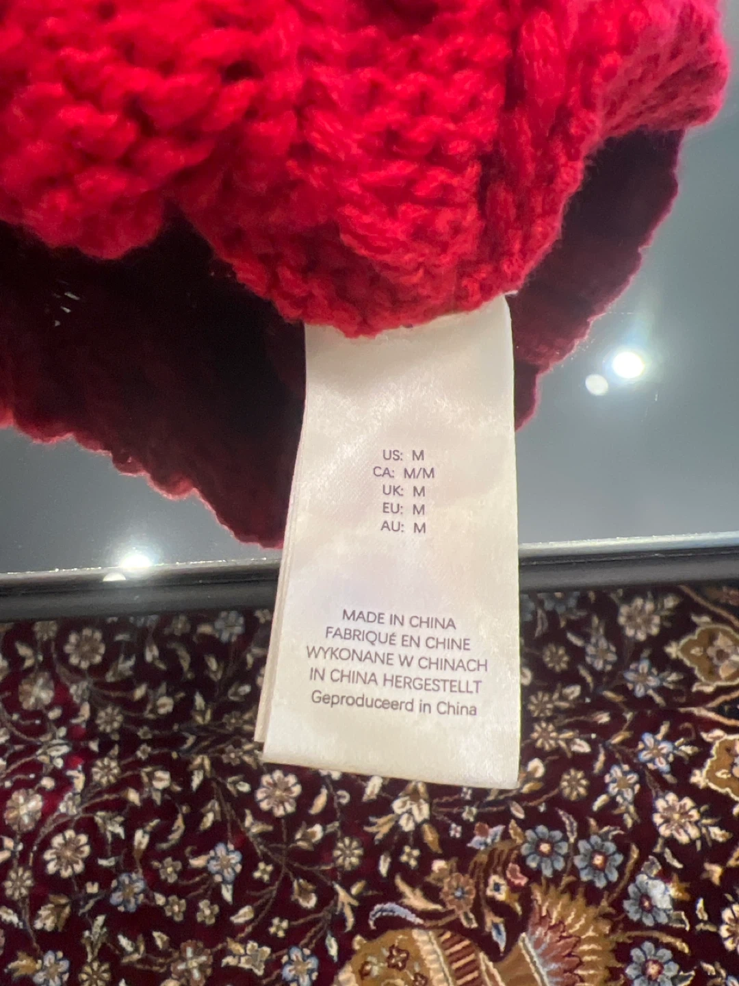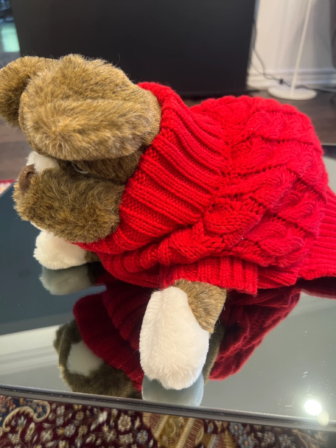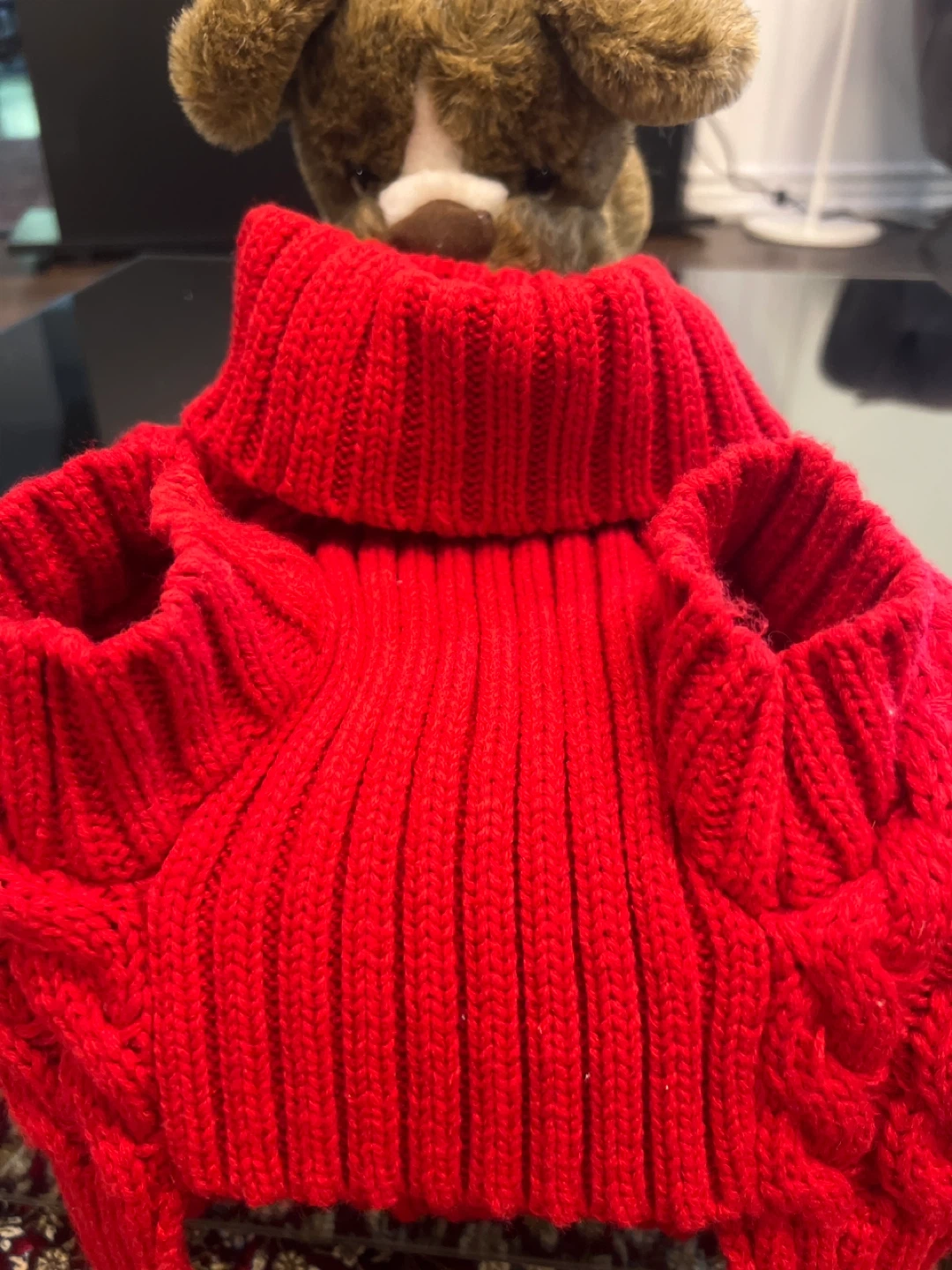 A cozy red dog sweater, perfect for keeping your furry friend warm! It's a size medium and features a cute cable knit design. The sweater has a turtleneck and is easy to put on and take off