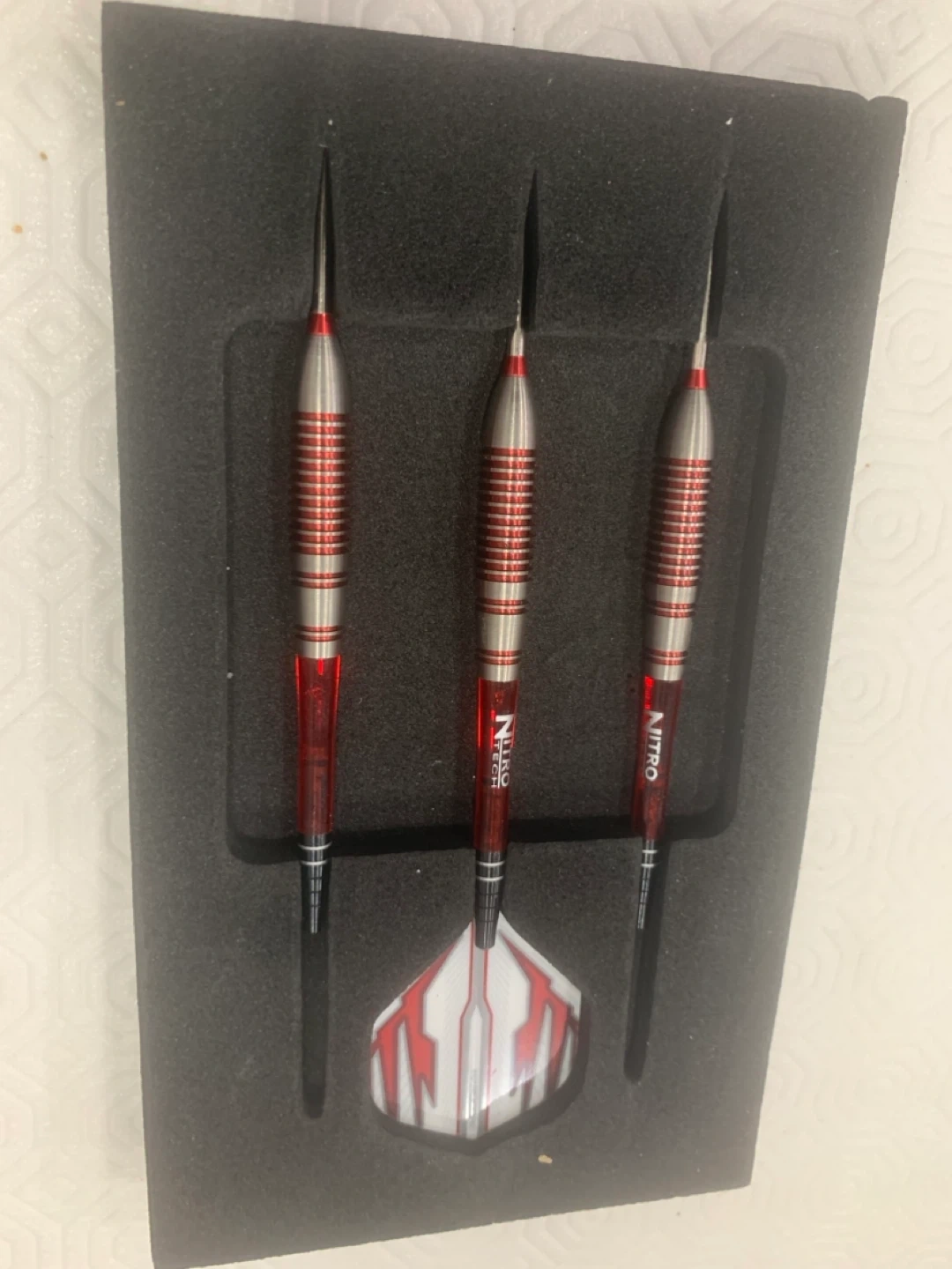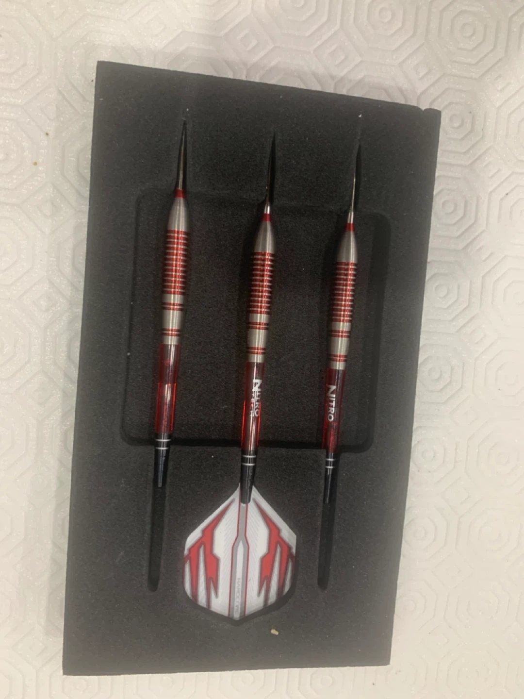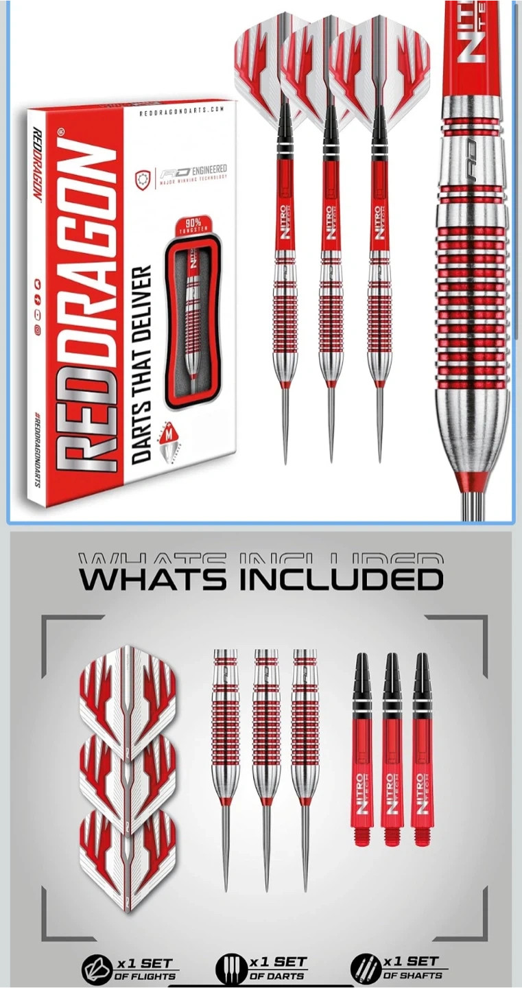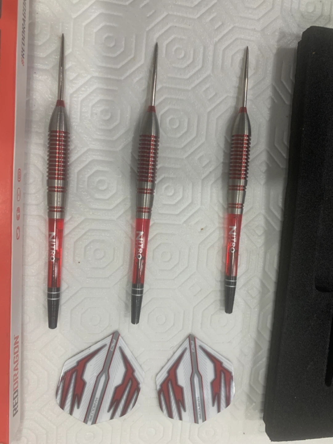 Selling a set of Red Dragon darts! They come with NitroTech shafts and hardcore flights. The darts are 90% tungsten and available in 24g, 26g, and 28g. Also included is a set of flights and shafts. The shafts are a medium size (42mm).