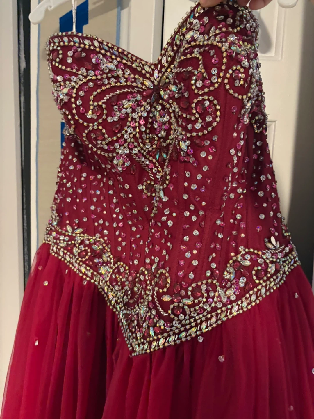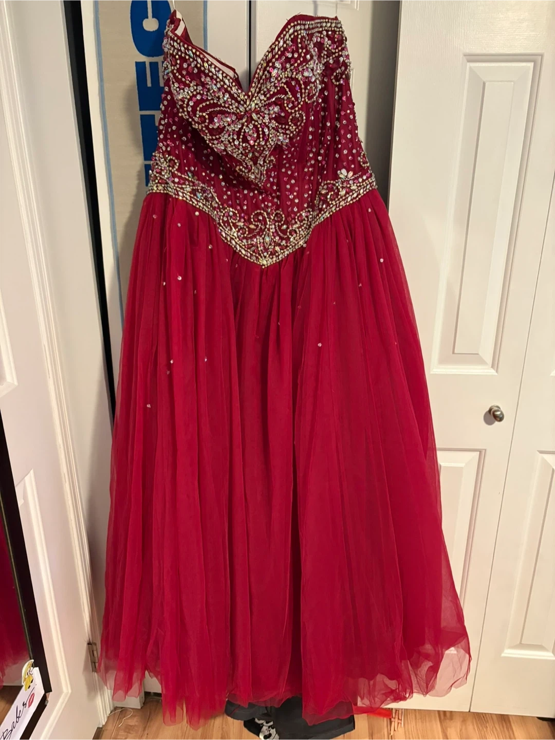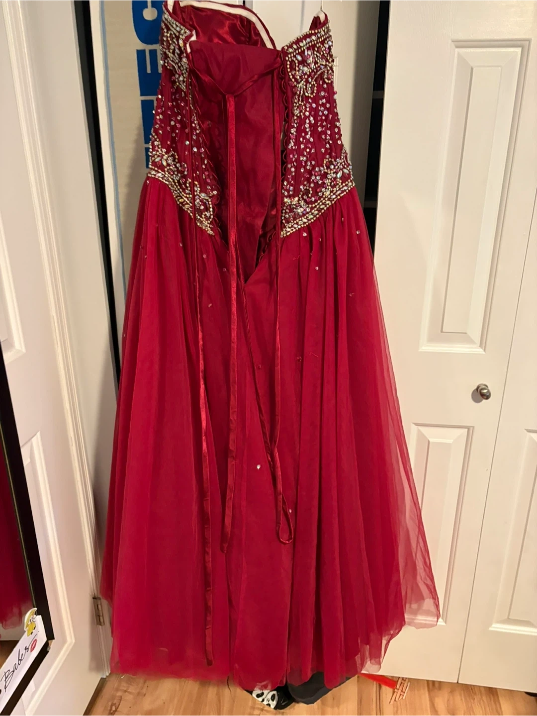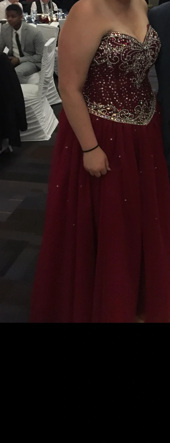 Beautiful red grad dress with intricate embellishments. Perfect for prom or any special occasion! It's in quite good condition and is ready for a new home!