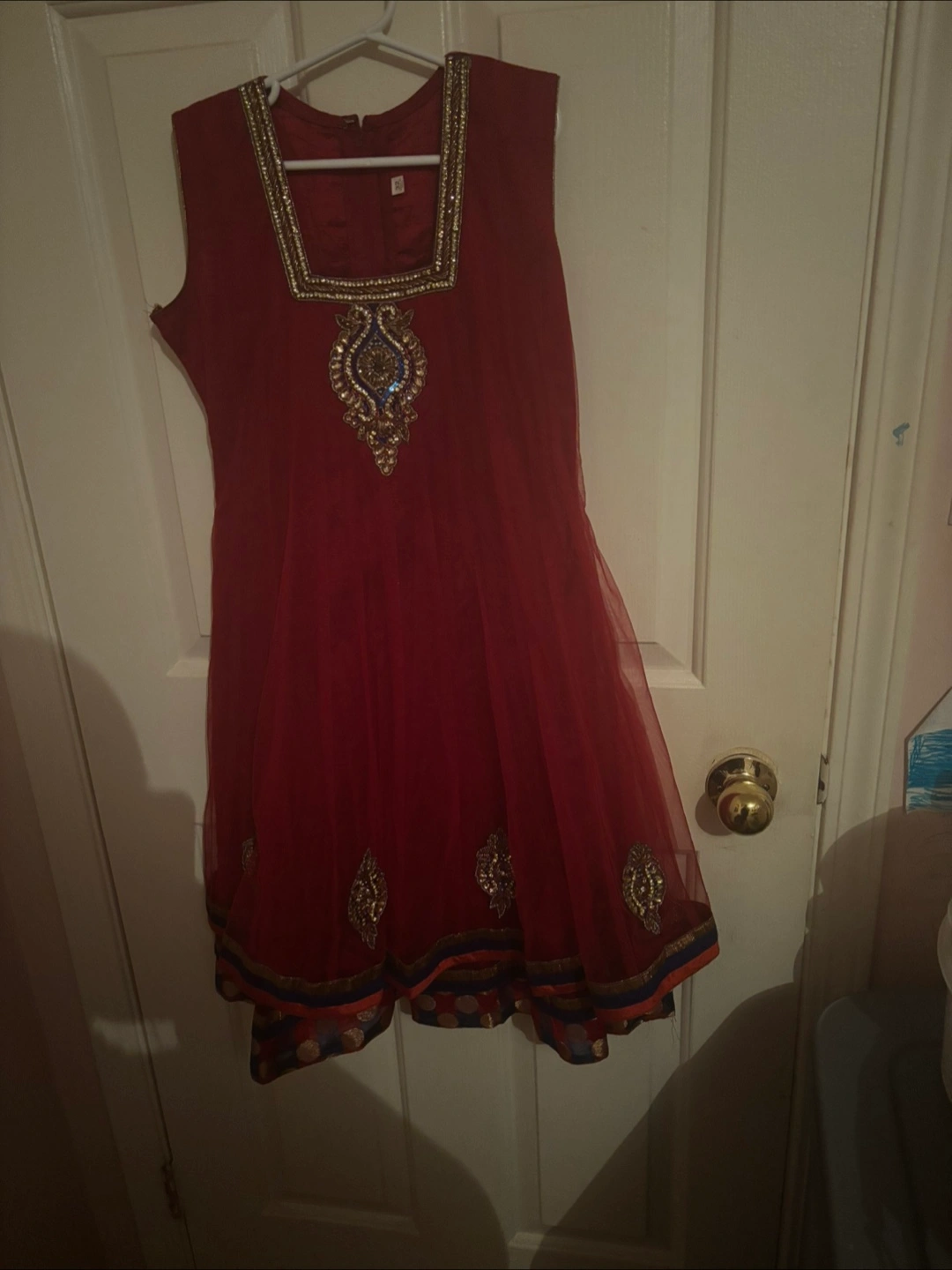 A lovely red dress with intricate gold embroidery. It's in great condition and ready for a new home!