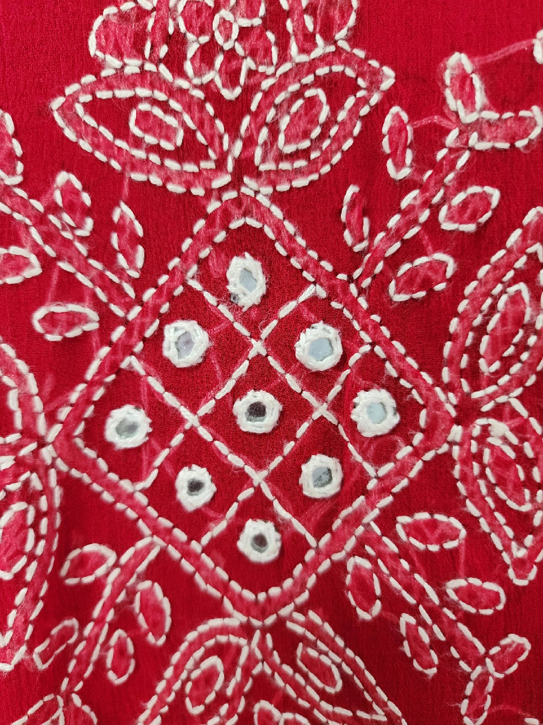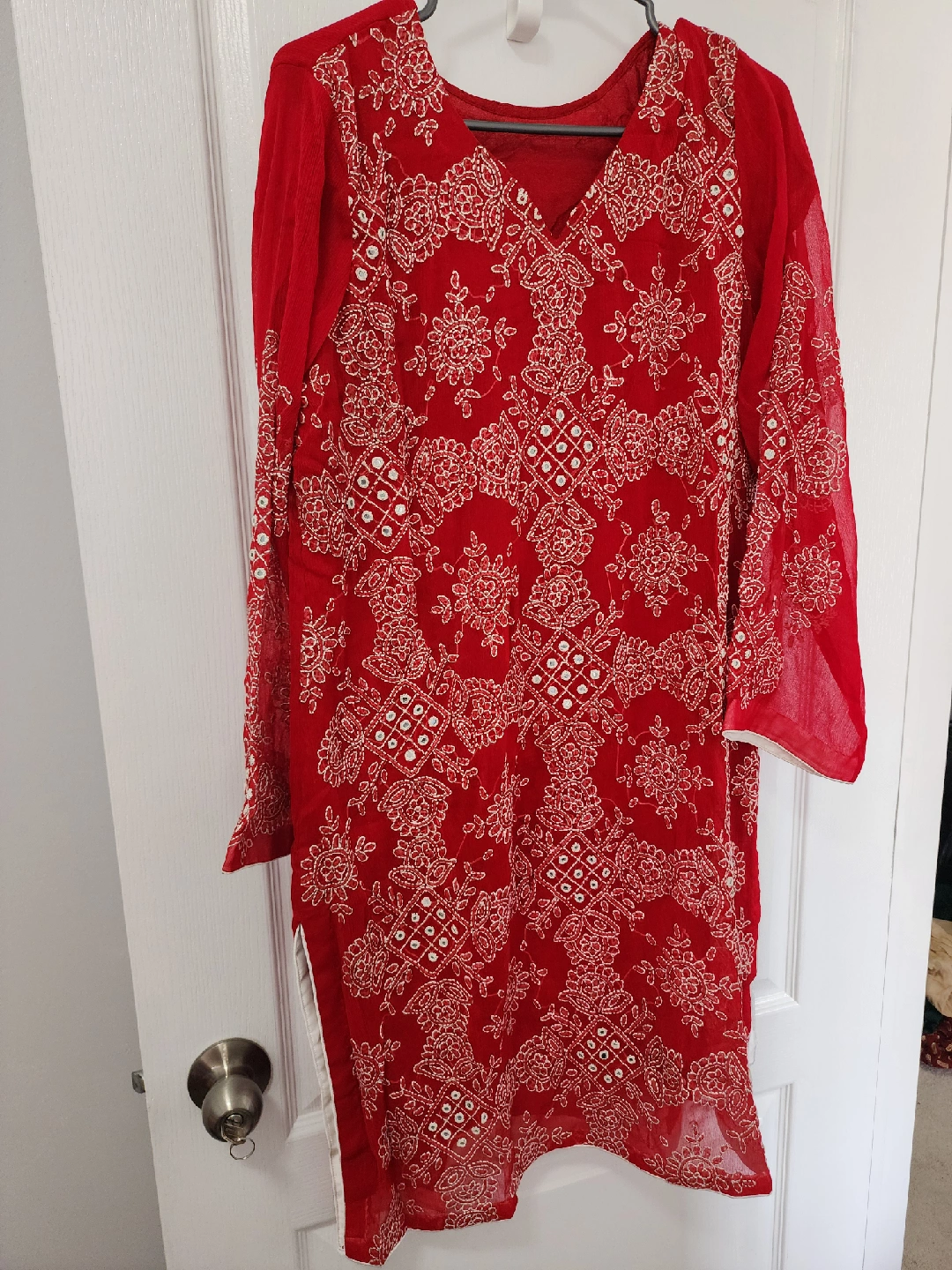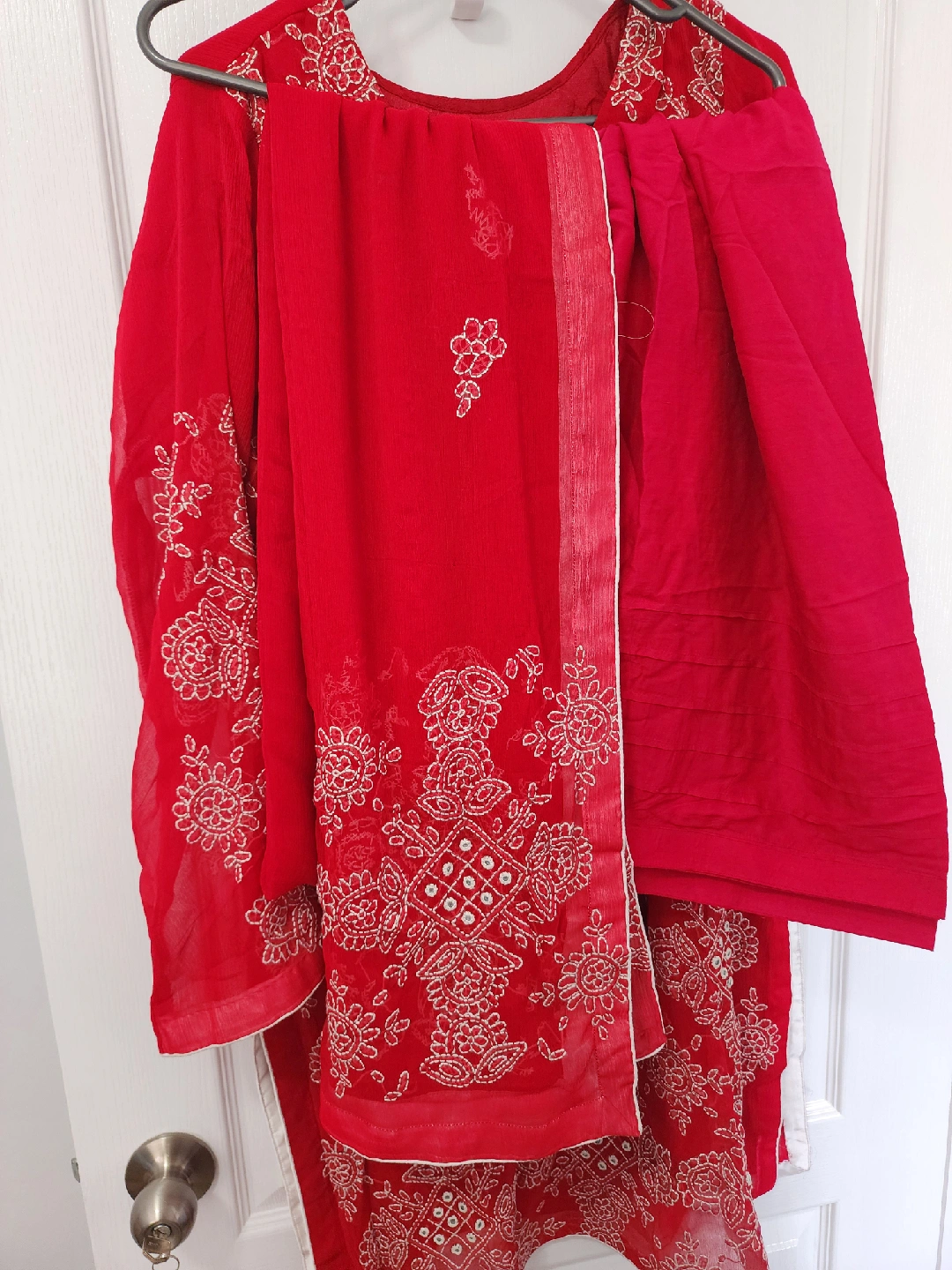 Beautiful red salwar kameez suit with intricate white embroidery! The fabric is lightweight and flowy, perfect for summer. Includes the kameez (top), salwar (pants), and dupatta (scarf).