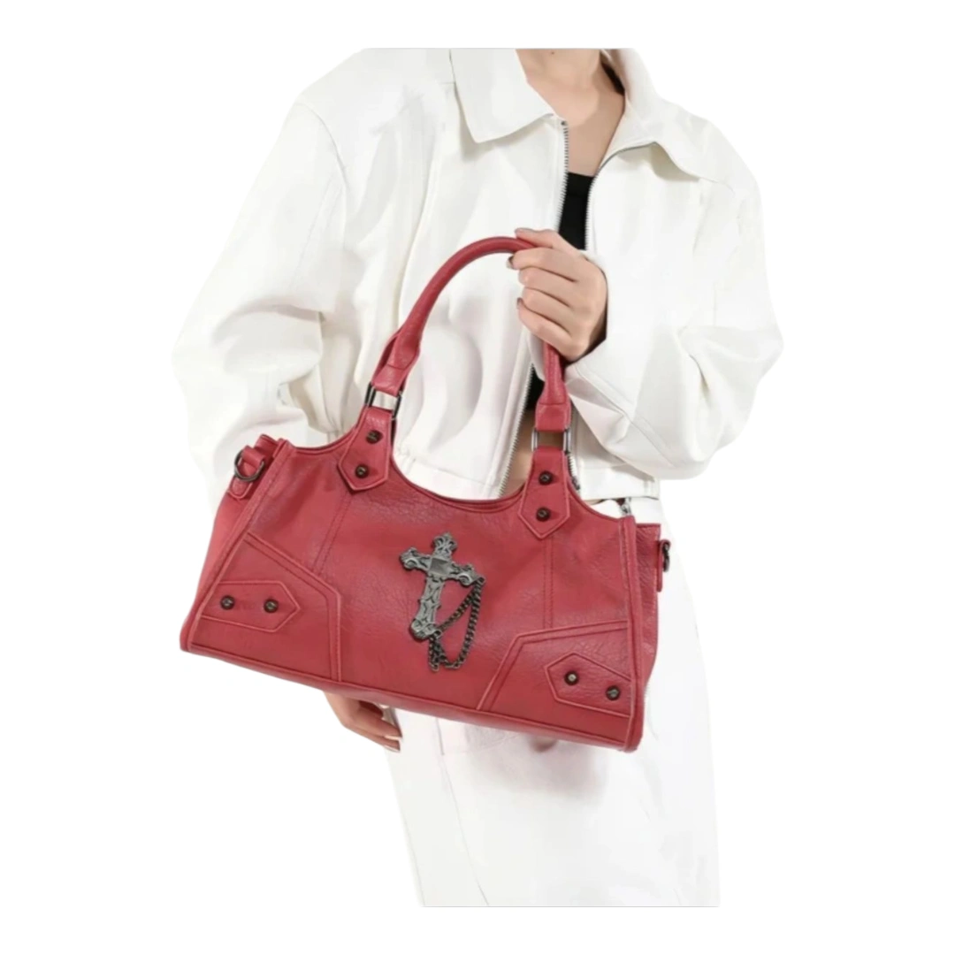 This is a red faux leather handbag. It has a unique cross detail on the front. It's in great condition and ready for a new home!
