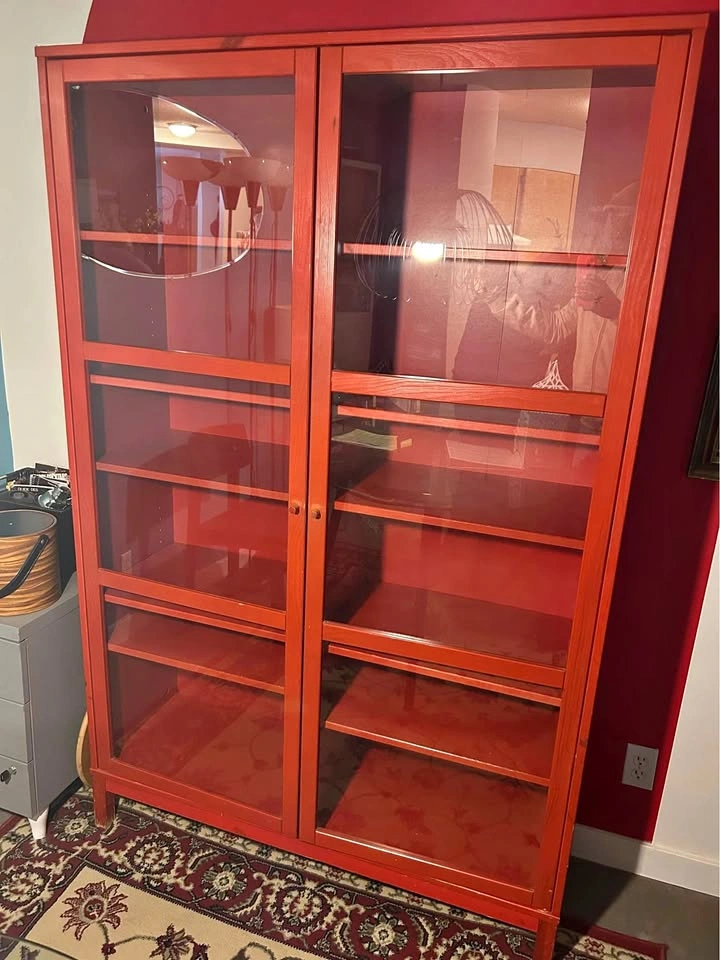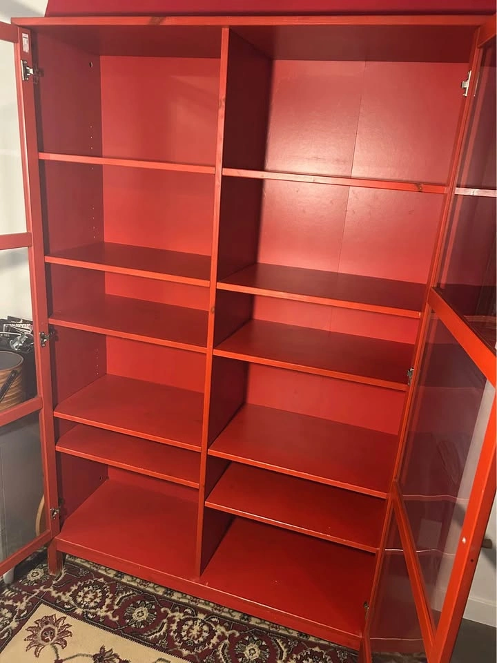 14.5 x 45 x 68” (including 6” legs) 37 x 114 x 173cm ( including 15cm legs) Glass doors 4 adjustable shelves & 1 fixed on each side.