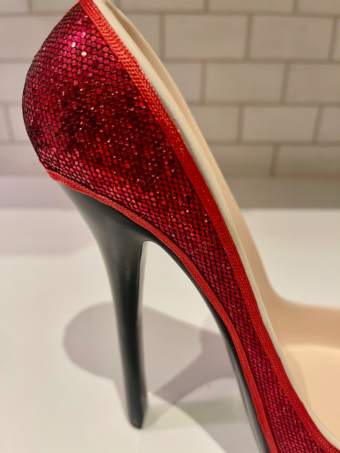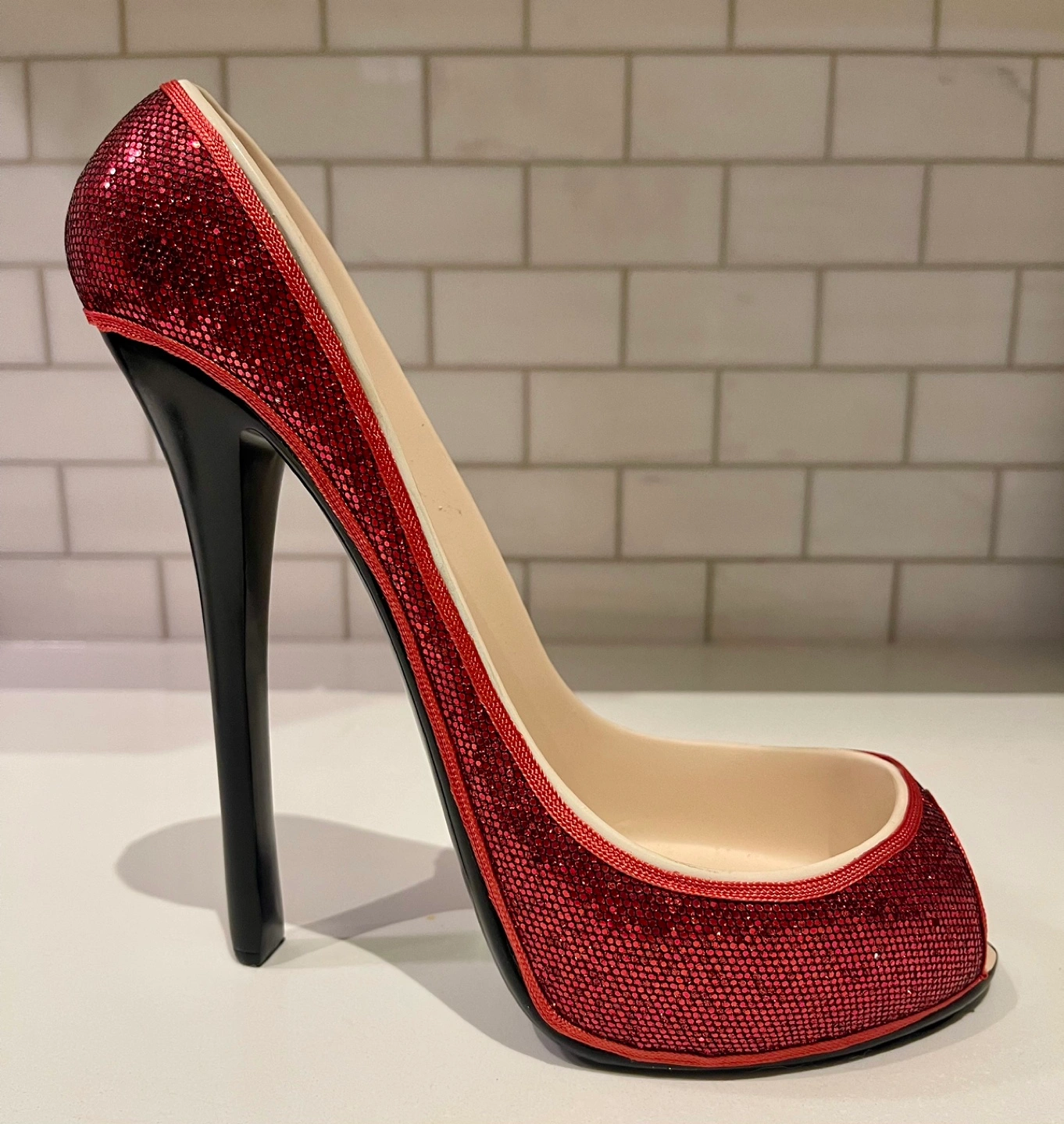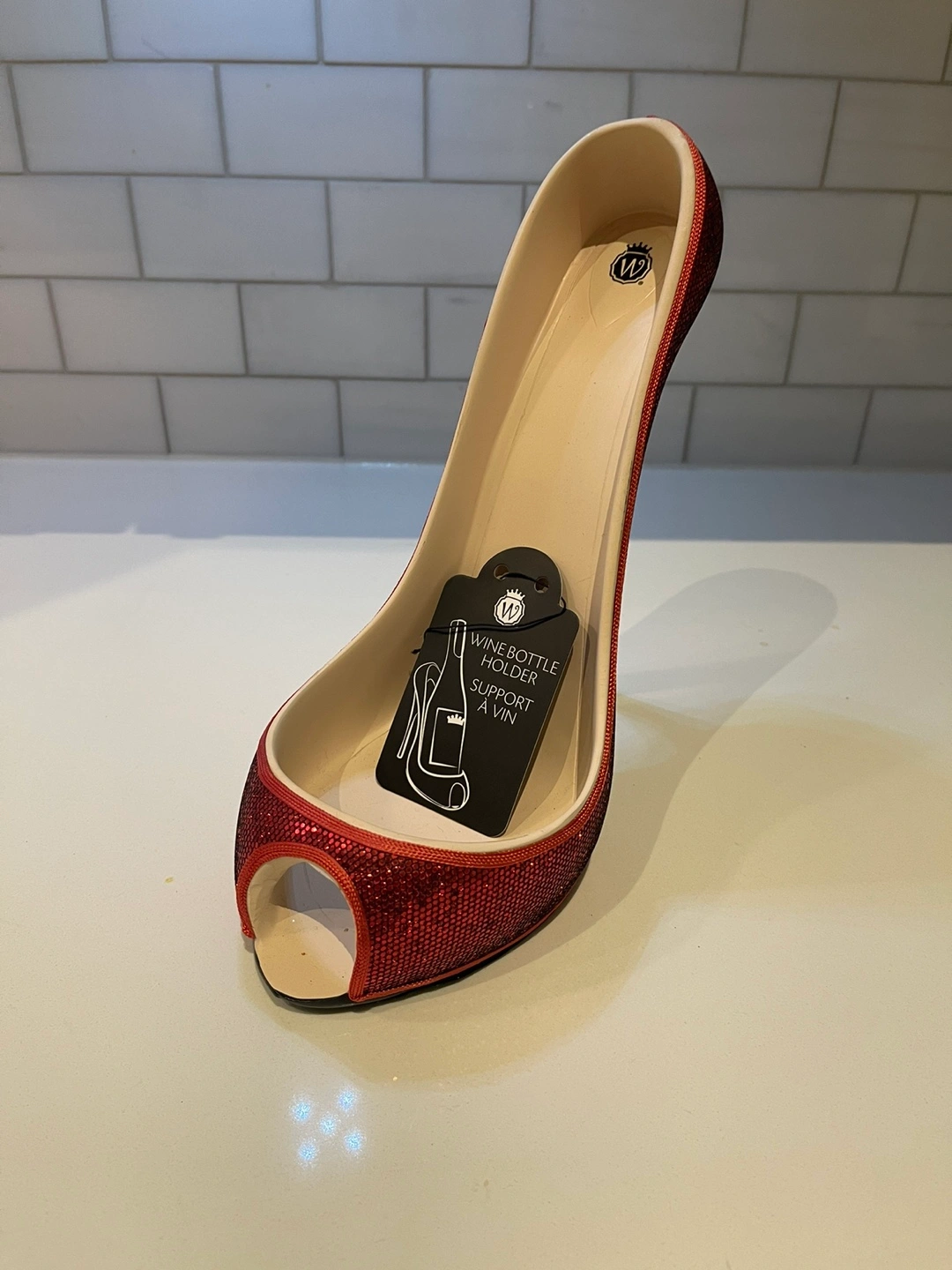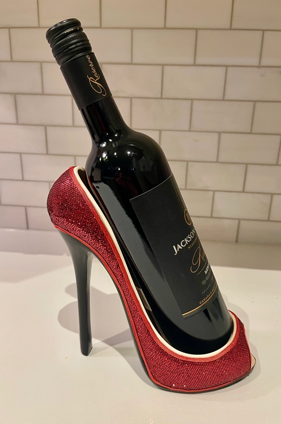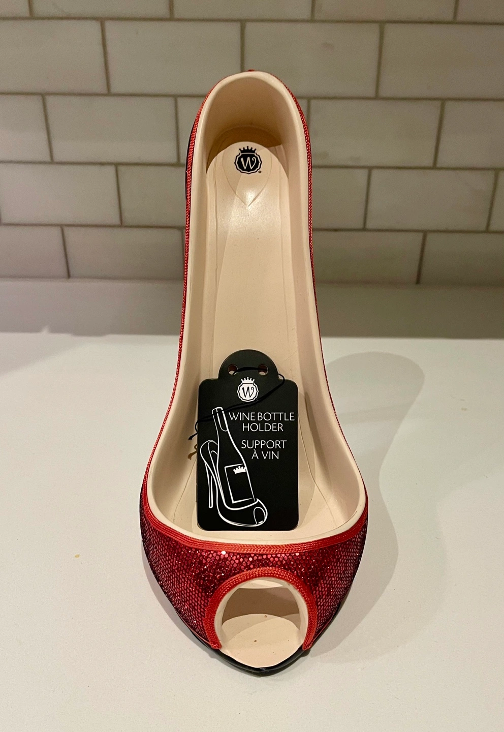 Red glitter high heel wine bottle holder. New, never used. 8 inches tall. Ceramic. Pick up intersection Trafalgar & Dundas in Oakville.