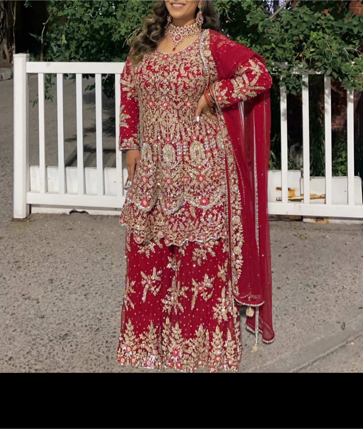 Beautiful red and gold Indian outfit! Perfect for a wedding or special occasion. The outfit is intricately embellished, making it a stunning and unique piece.