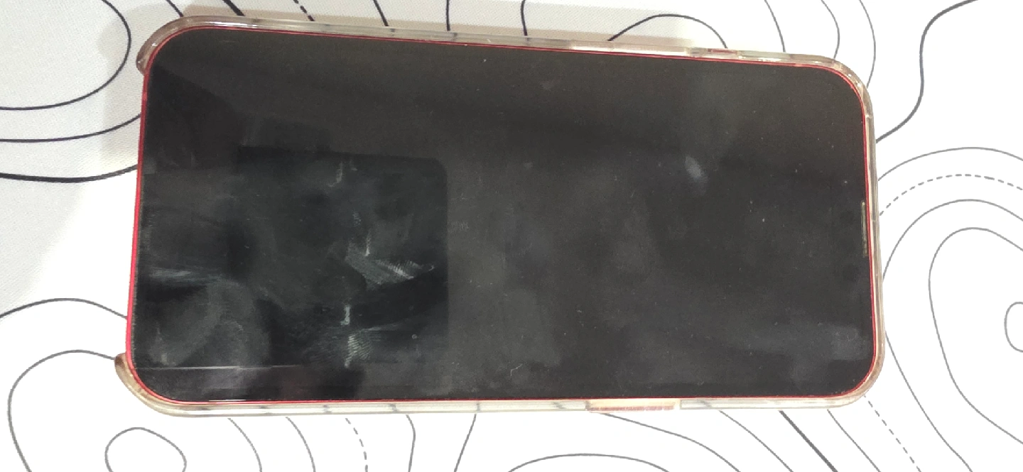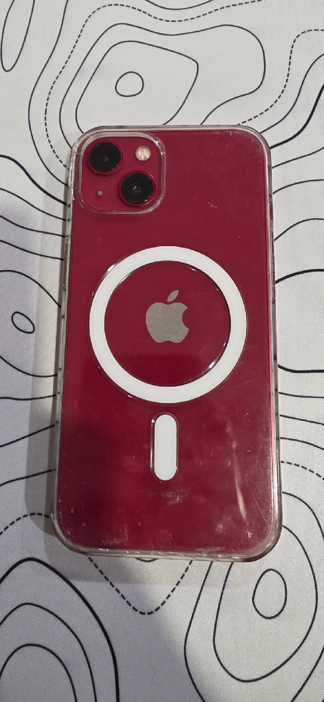RED iPhone 13. It's in used condition with some scratches. The phone has a MagSafe case.