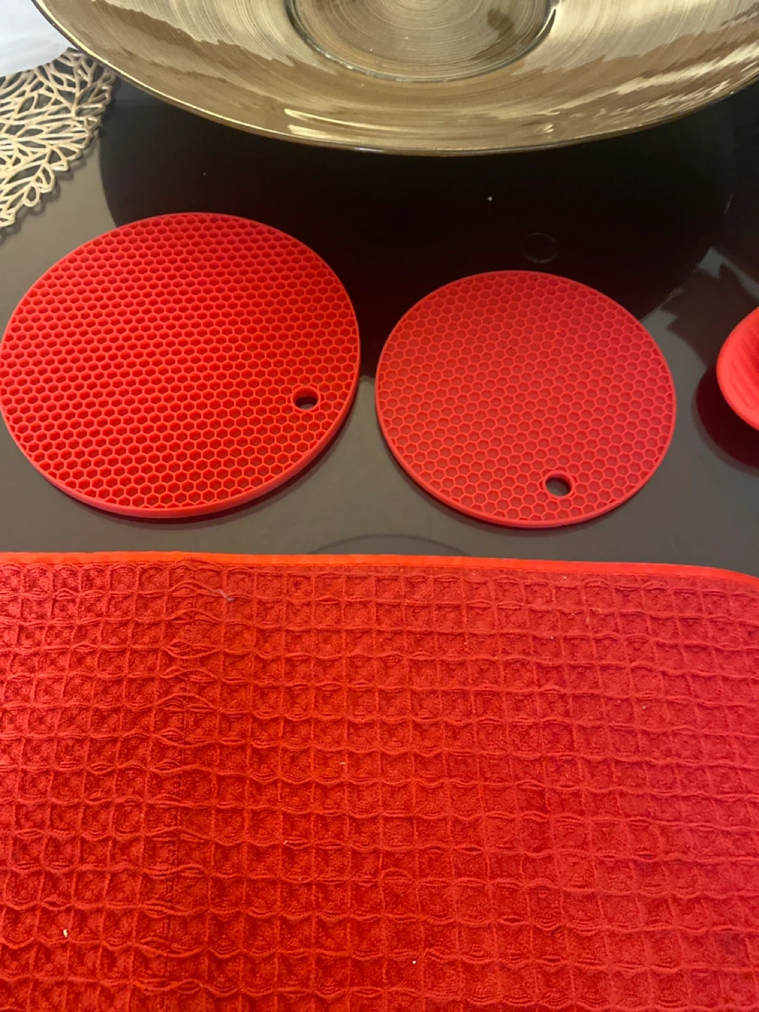 Selling a handy red kitchen set! Includes an oven mitt, a pinch mitt, two round trivets, and a rectangular trivet. Great for protecting your hands and surfaces while cooking and baking in the kitchen