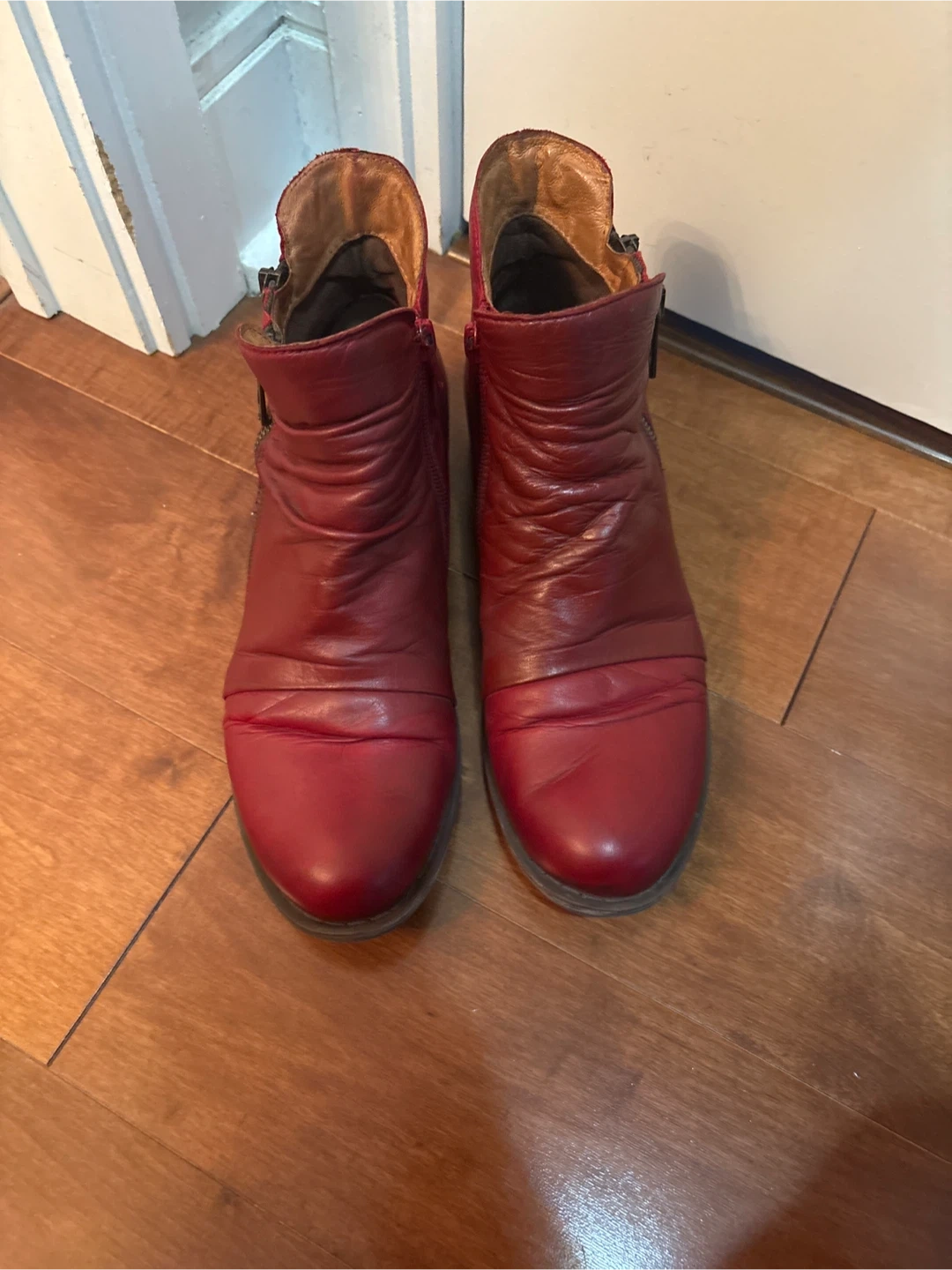 Selling a pair of Italian red leather ankle boots in EU size 39. They have a decorative zipper closure and are in good condition, although they were worn a couple of times. Perfect for adding a pop of colour to your outfit! Bought in Ireland for 130 euros.