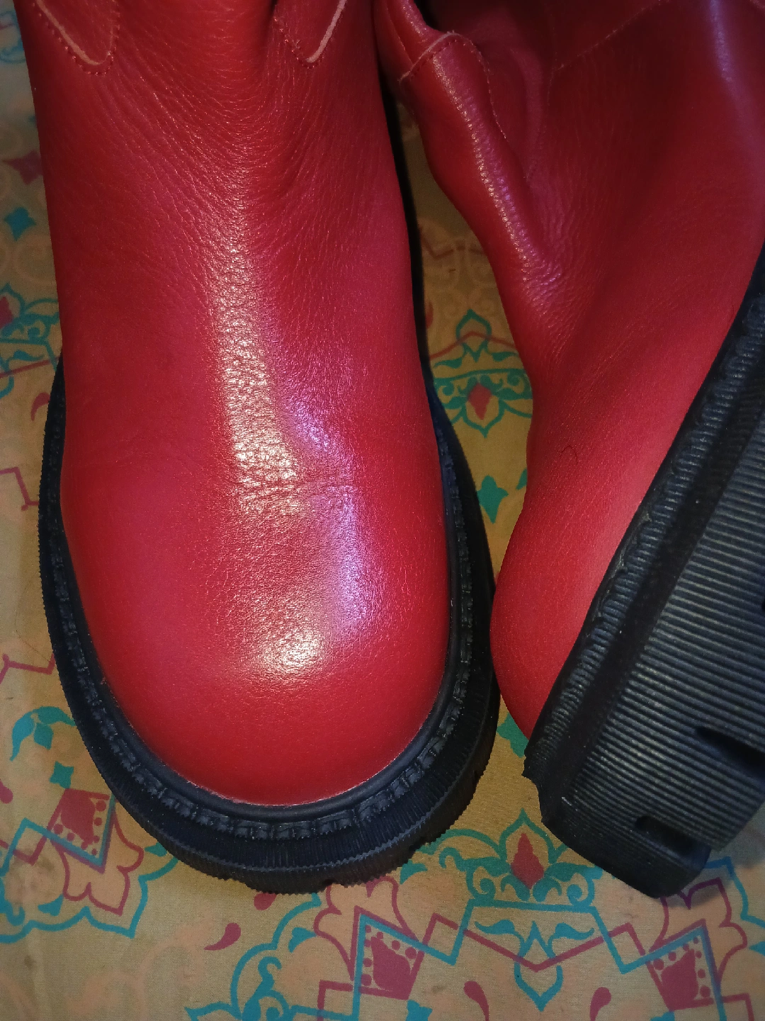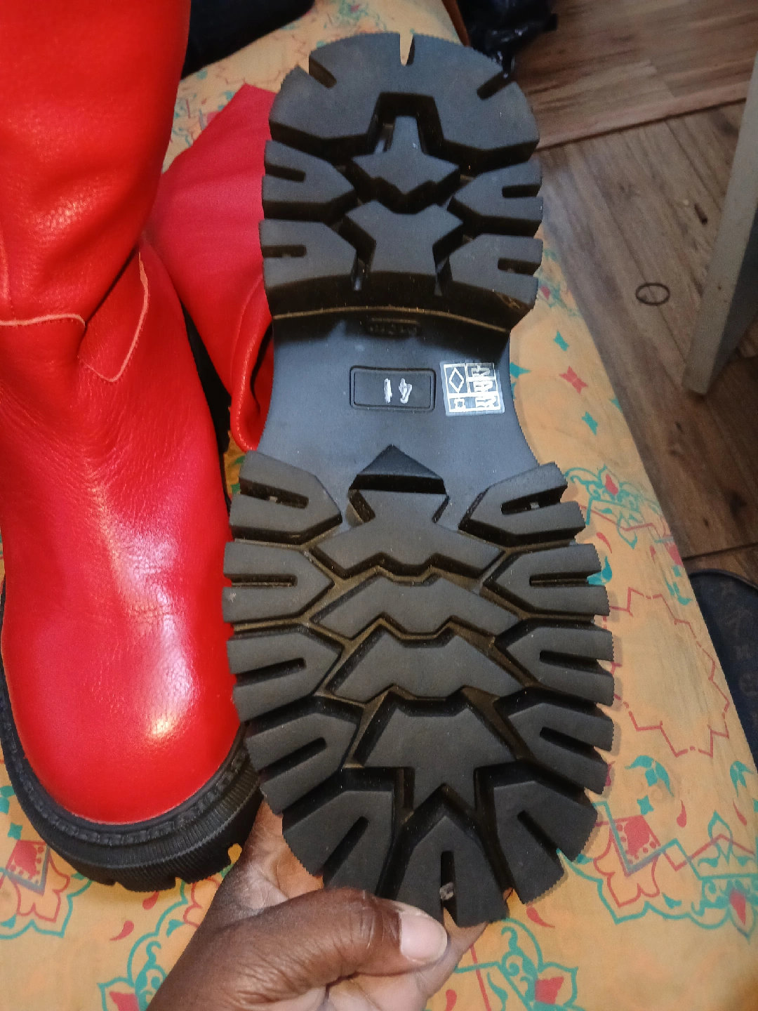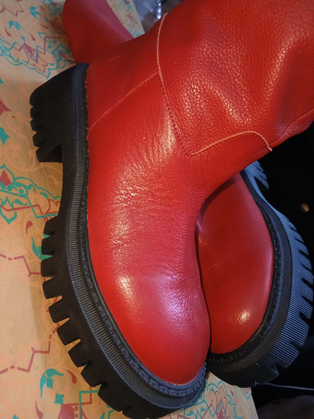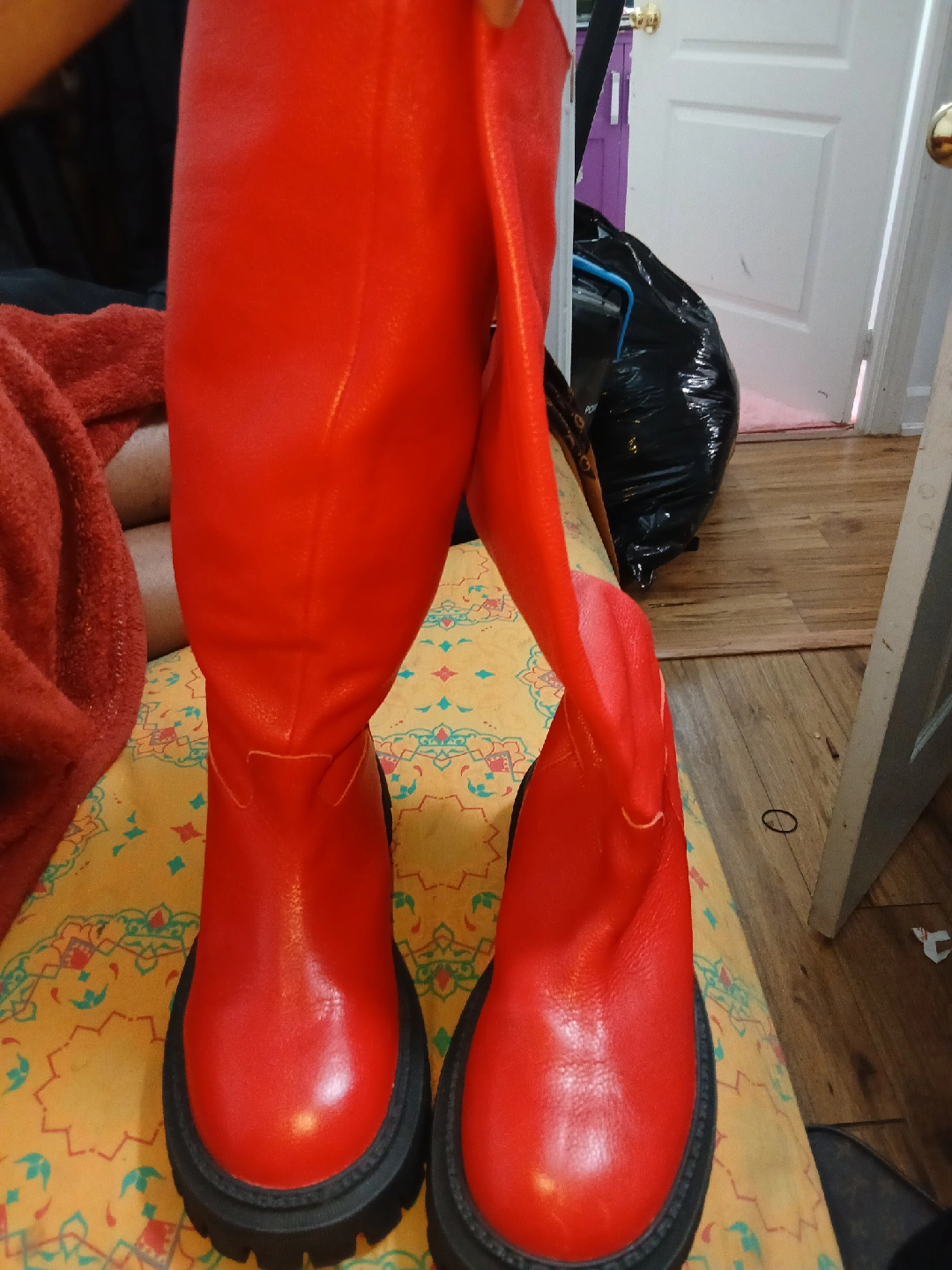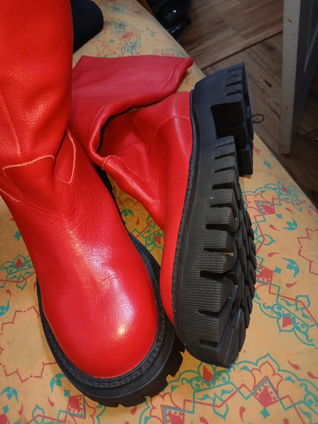 Selling a pair of vibrant red knee-high boots! They're size 41 and feature a chunky black sole. These boots are sure to make a statement with their bold colour and stylish design