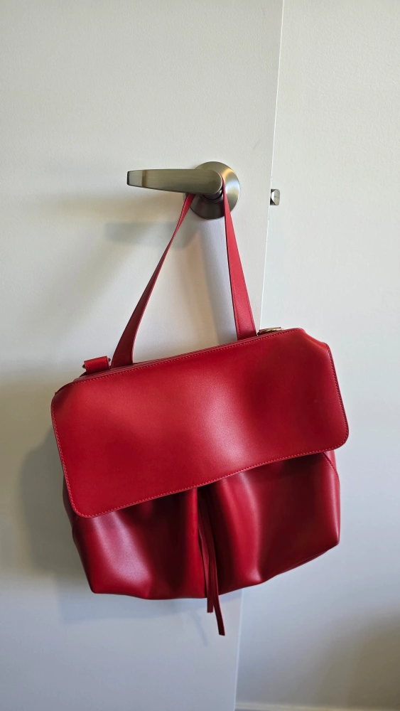 This is a stylish red leather shoulder bag. It's perfect for everyday use and adds a pop of colour to any outfit. The bag is in great condition and ready for a new home!