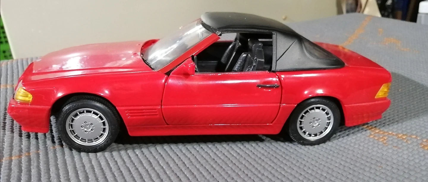 Selling a red Mercedes-Benz SL 118 diecast model car. It's a detailed replica with a black convertible top. A great addition to any car collection!