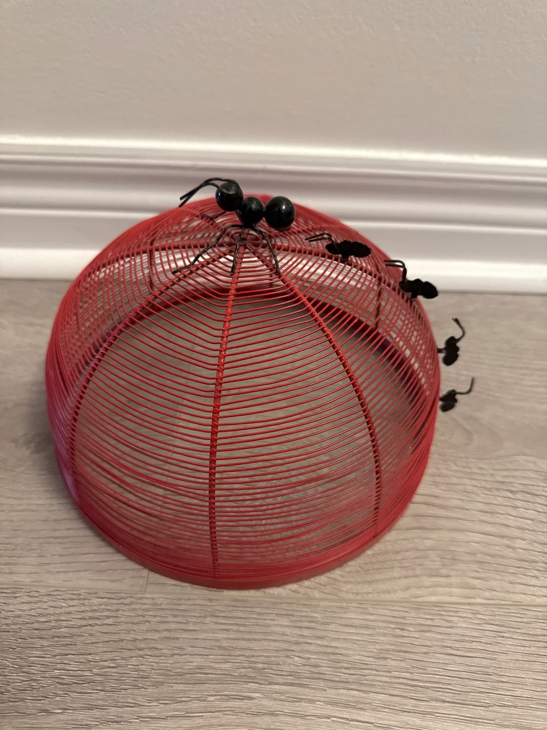 A fun red metal basket decorated with little black ants. I think it’s used to cover food to prevent flies and other bugs from getting in. Also a nice decorative piece Take a look at my other items if interested. Can bundle with my other stuff for cheaper! Can meetup in Markham. Cash only please