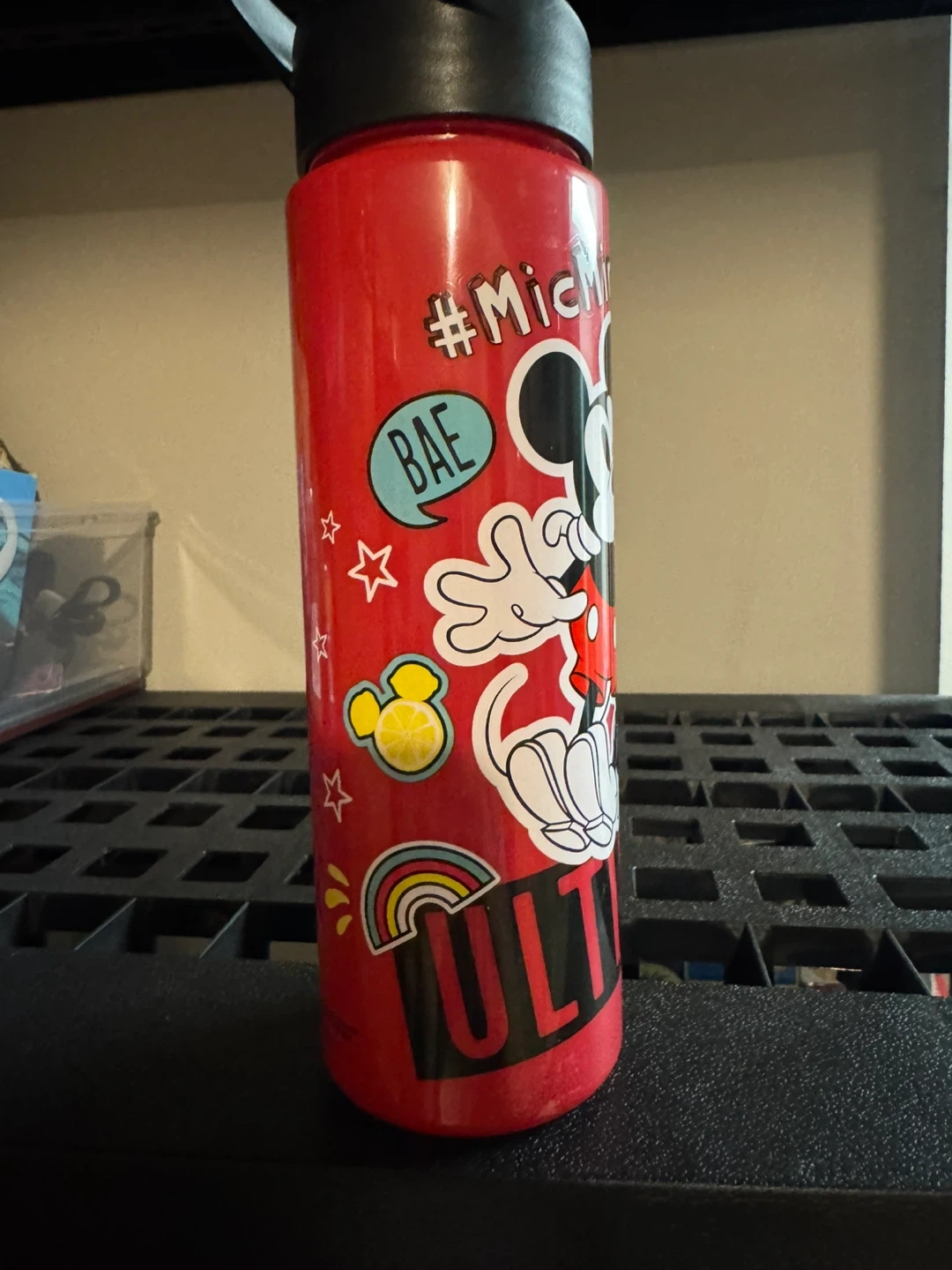 Selling a cute red water bottle featuring Mickey Mouse designs! It's perfect for staying hydrated on the go. The bottle comes with a black lid and a straw