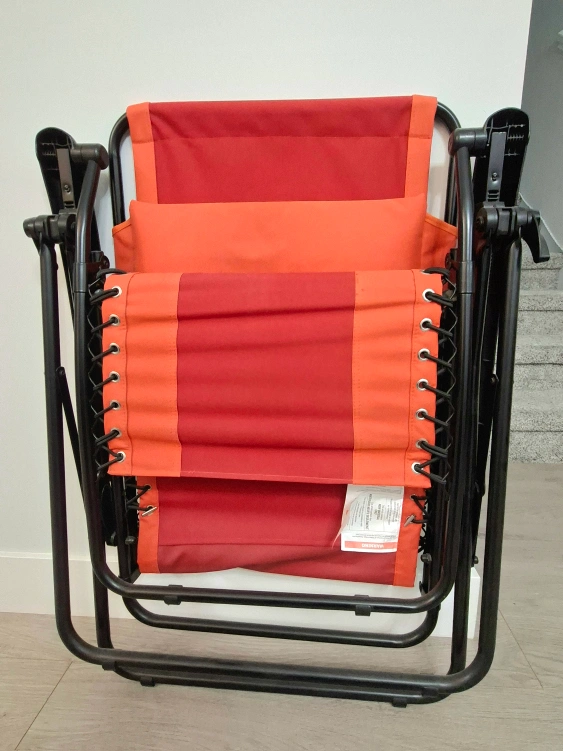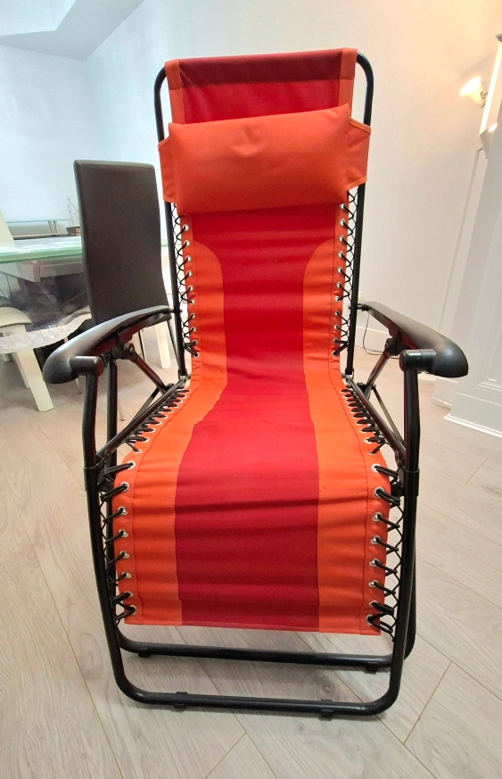 Looking to sell my zero gravity lounge chair. It's in like new condition and super comfy for relaxing in the backyard or on the patio. The colours are a mix of red and orange, and it folds up nicely for easy storage