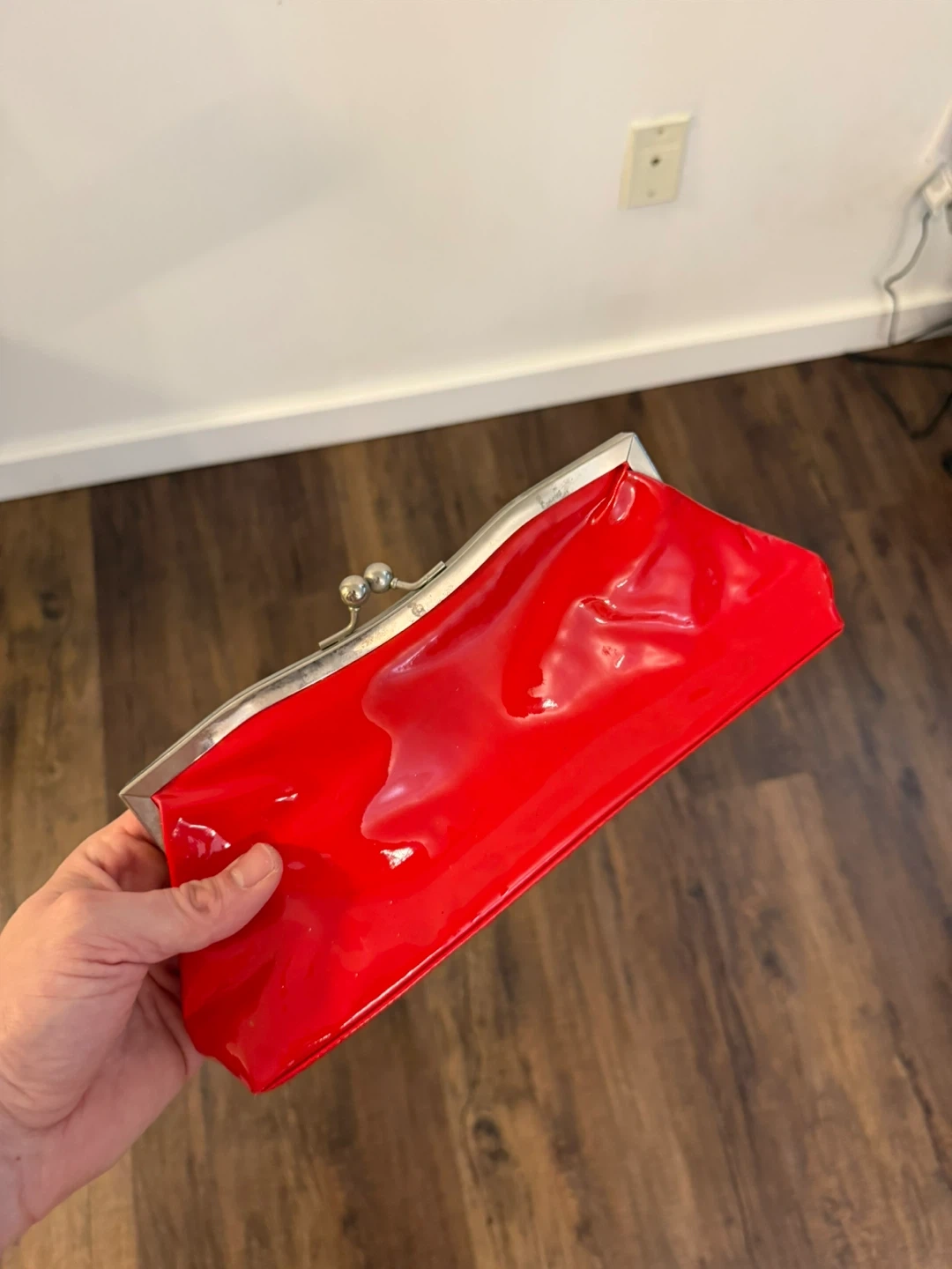Here's a bright red clutch with a patent leather finish! It's got a silver-tone frame and kiss-lock closure. Perfect for adding a pop of colour to your outfit!