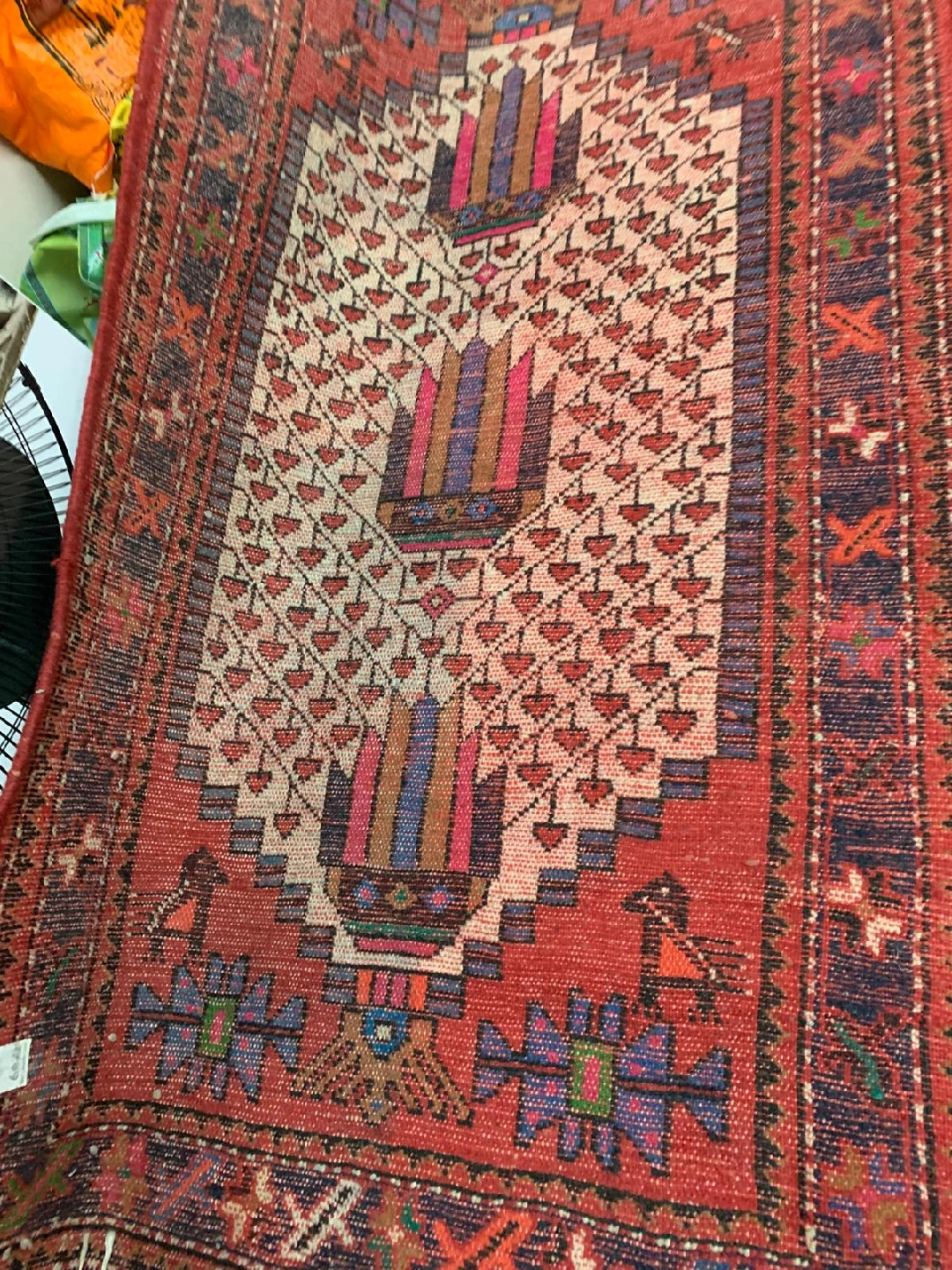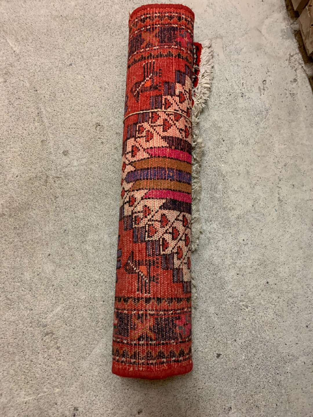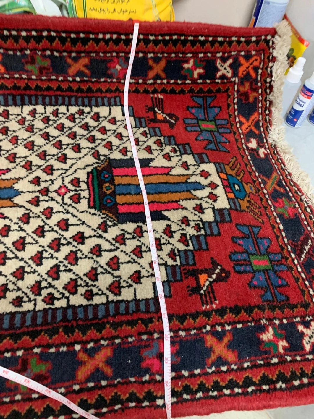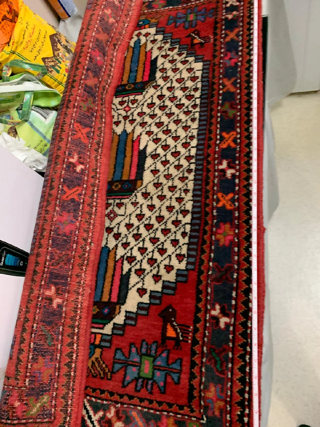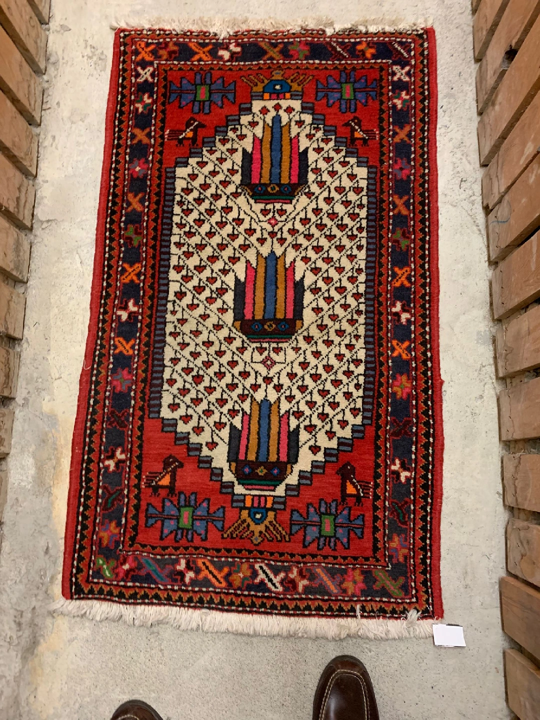 Selling a vibrant area rug with a unique pattern! It features a red, navy, and cream colour scheme with bird and geometric designs. The rug measures approximately 30 inches by 40 inches, making it a great size for smaller spaces or as an accent piece