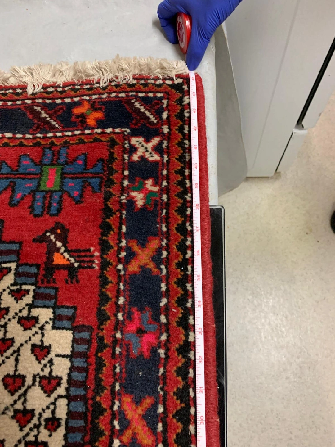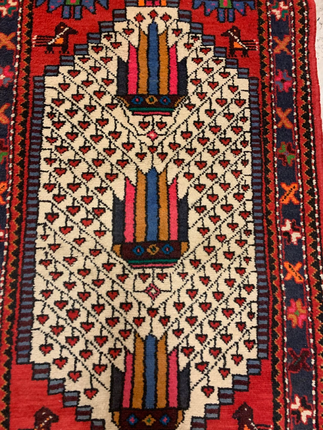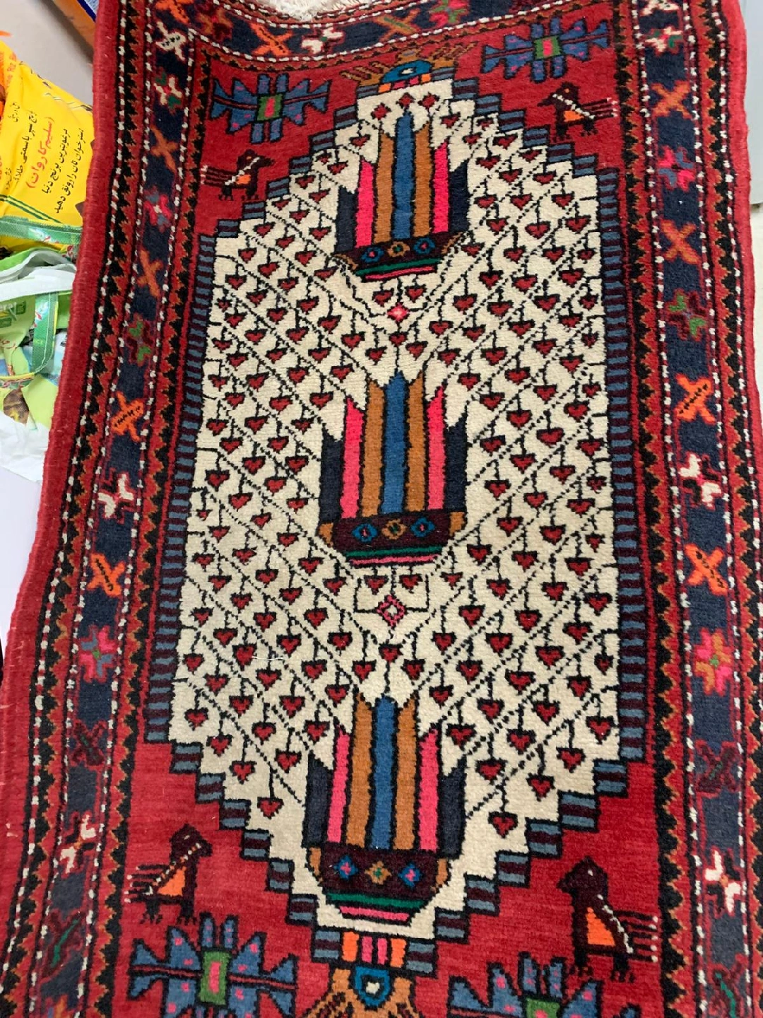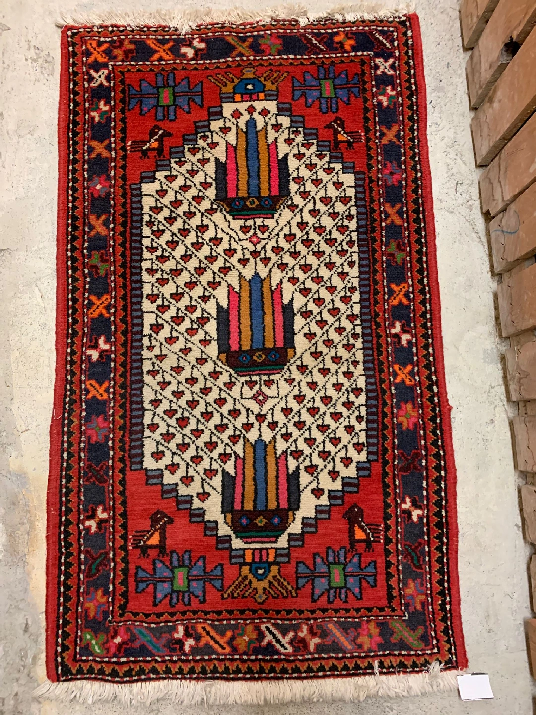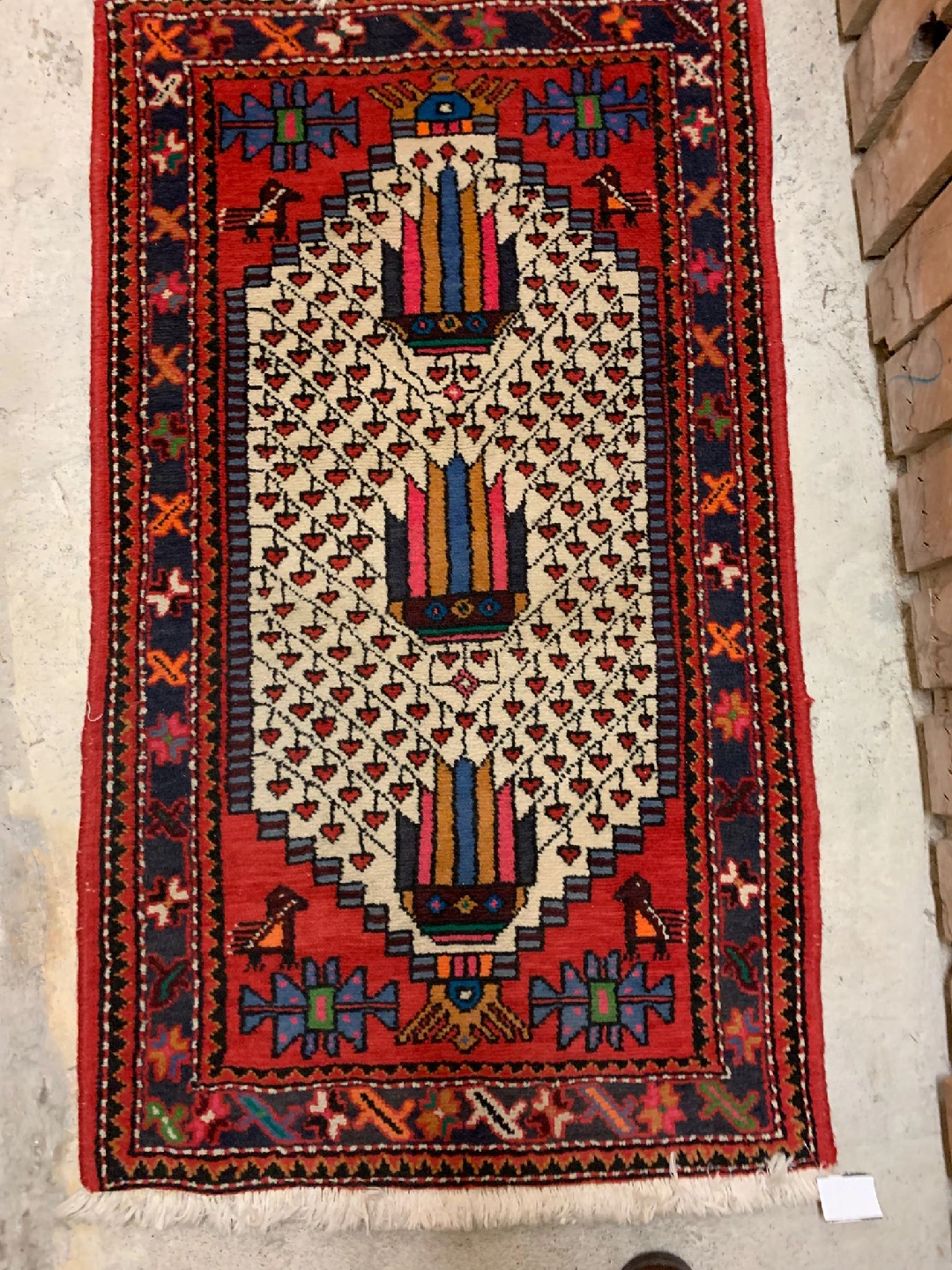 Selling a vibrant area rug with a unique pattern! It features a red, navy, and cream colour scheme with bird and geometric designs. The rug measures approximately 30 inches by 40 inches, making it a great size for smaller spaces or as an accent piece