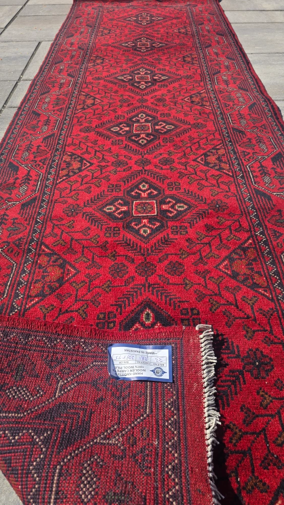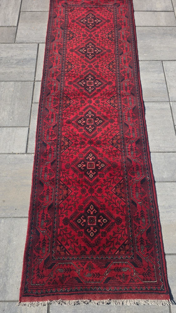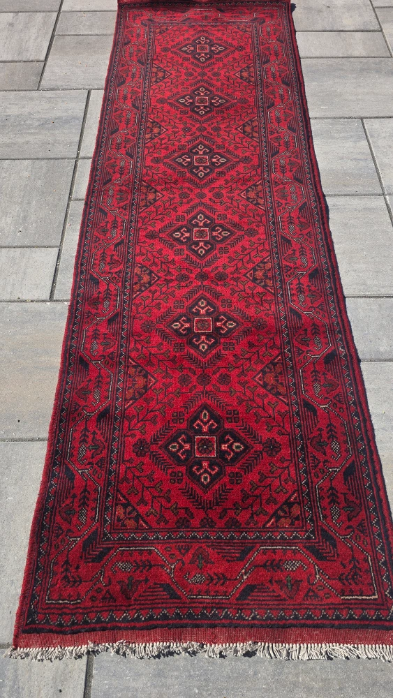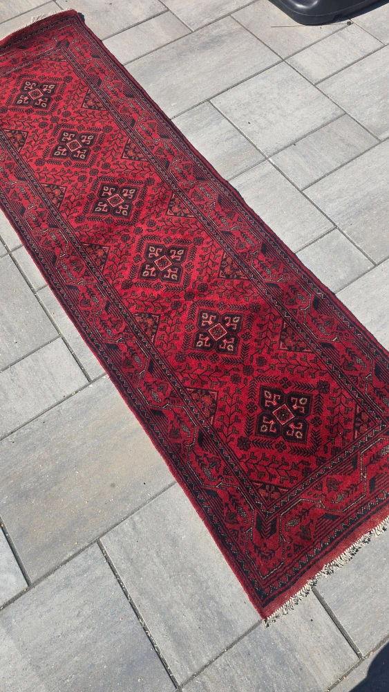 Selling a beautiful red hallway runner rug with a unique patterned design. It's in good condition and would look great in any home!