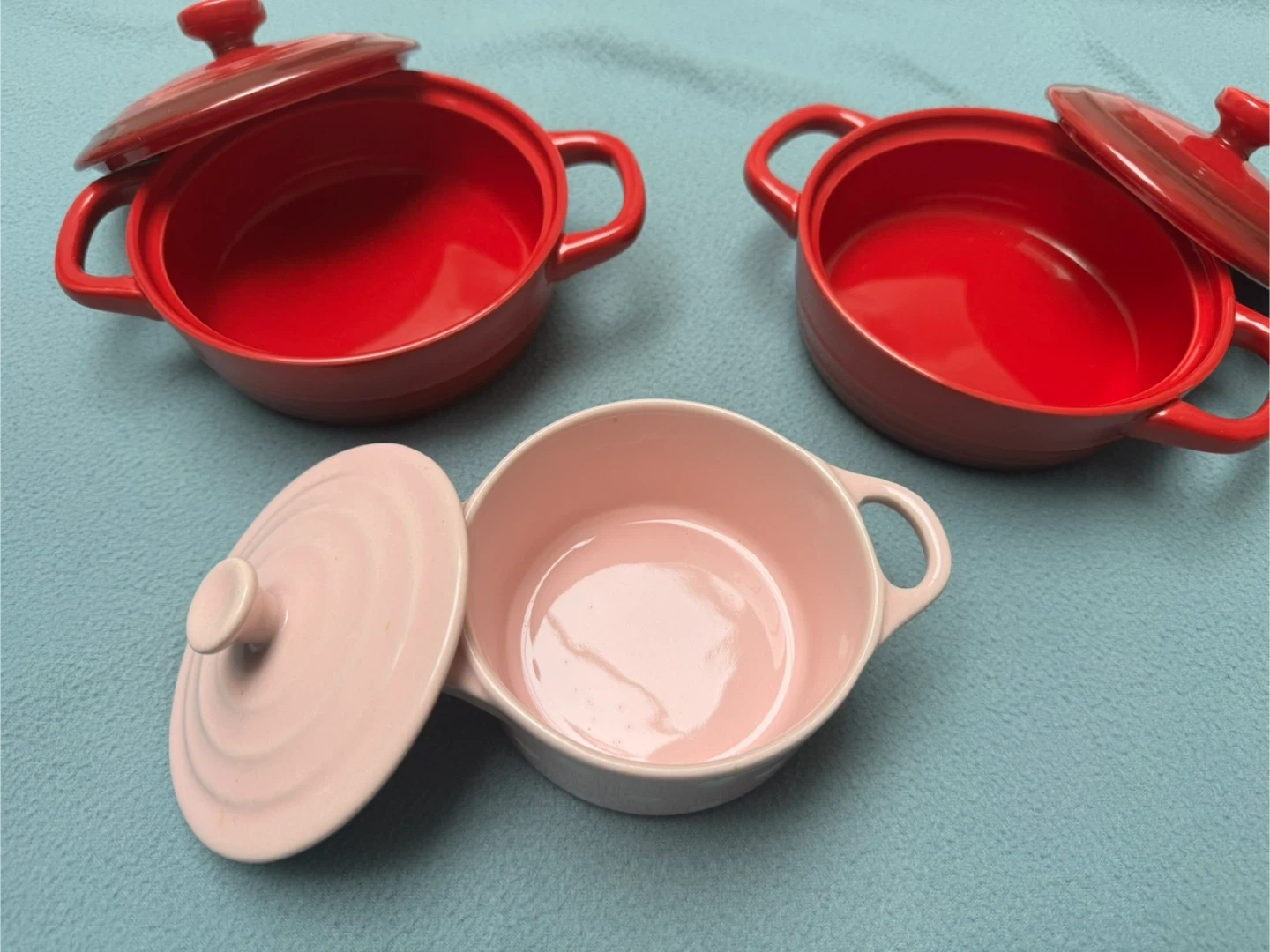 Selling a set of three cute casserole dishes! There are two ones and one light pink one. They each come with a matching lid. The pink one has little white hearts on the side. Perfect for individual servings or small side dishes
