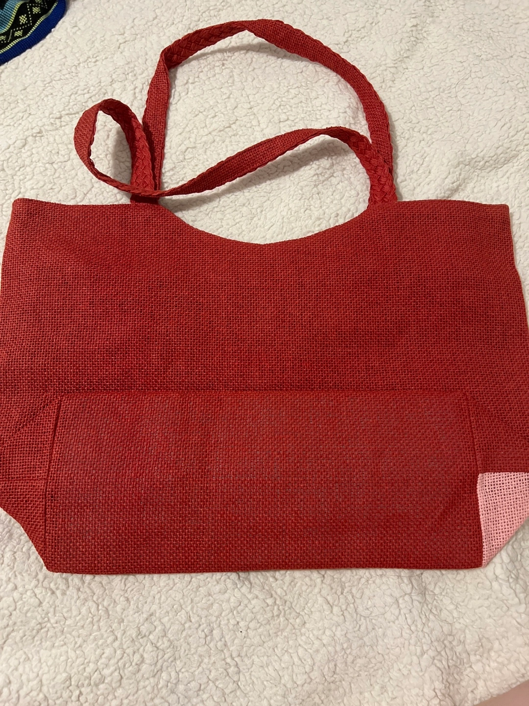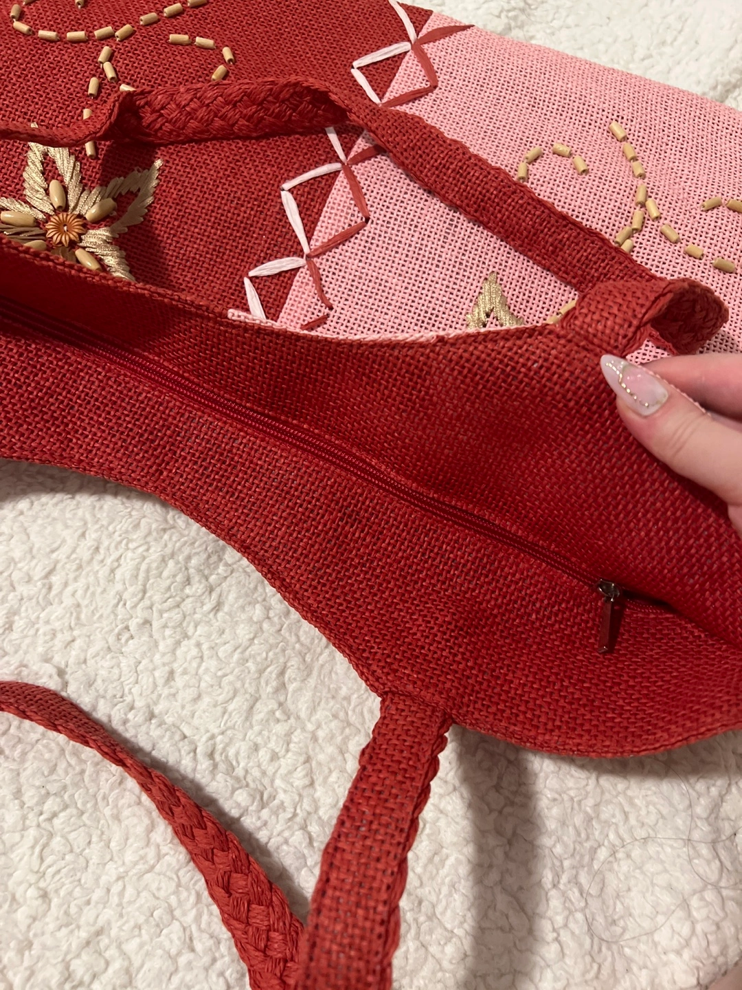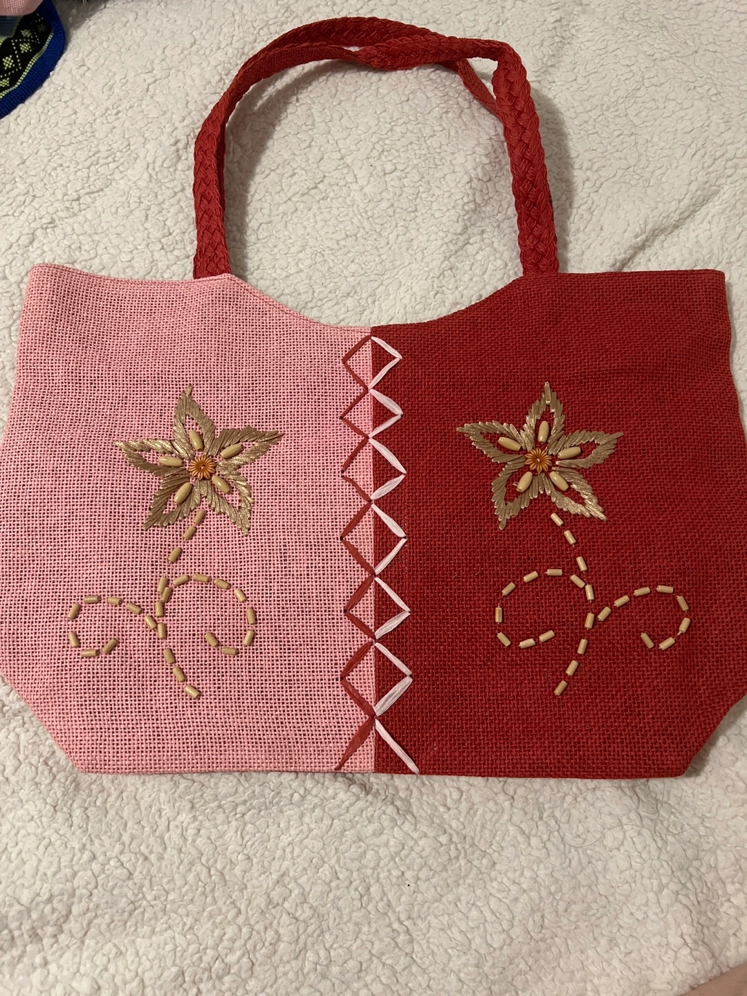 Check out this charming tote bag! It features a unique two-tone design with red and pink sides, adorned with decorative floral embroidery. The woven texture gives it a lovely, natural feel. Perfect for adding a pop of colour to your outfit! Pick up and Cash Only
