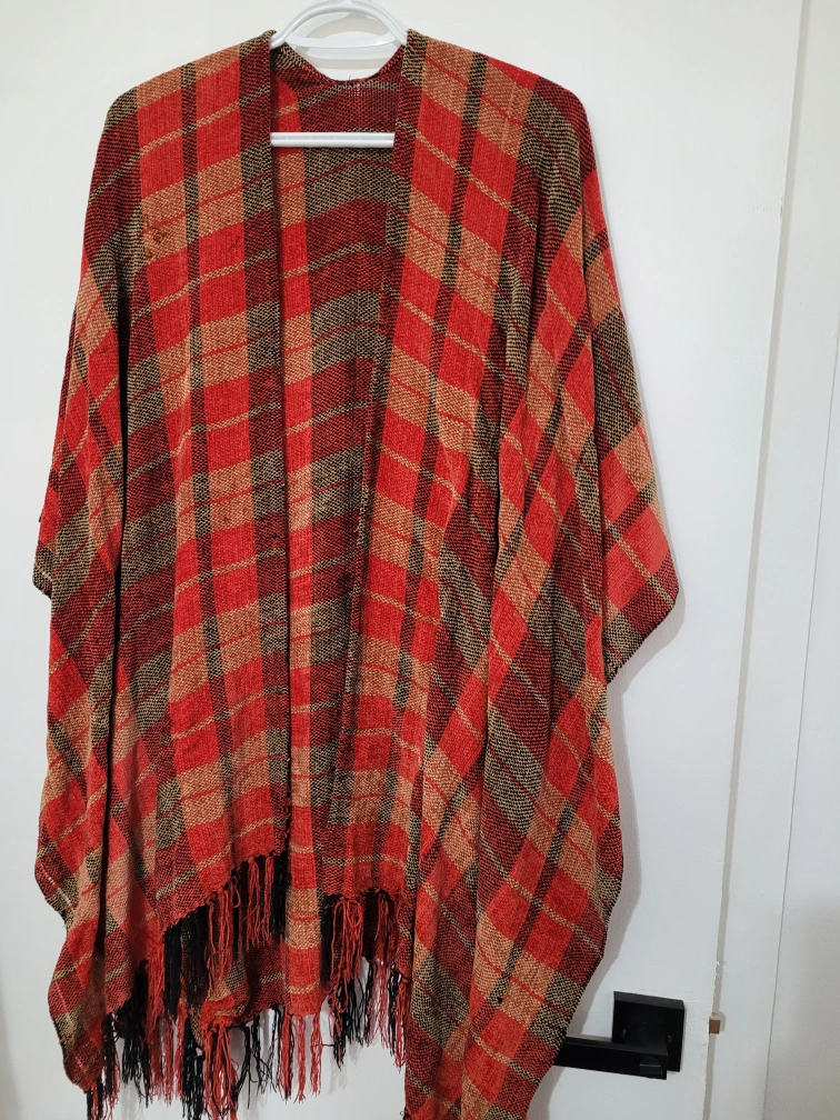 Cozy up with this stylish red plaid poncho! It features a classic plaid pattern in shades of red and brown, with a fringed hem for a touch of flair. Perfect for adding a layer of warmth on chilly days!