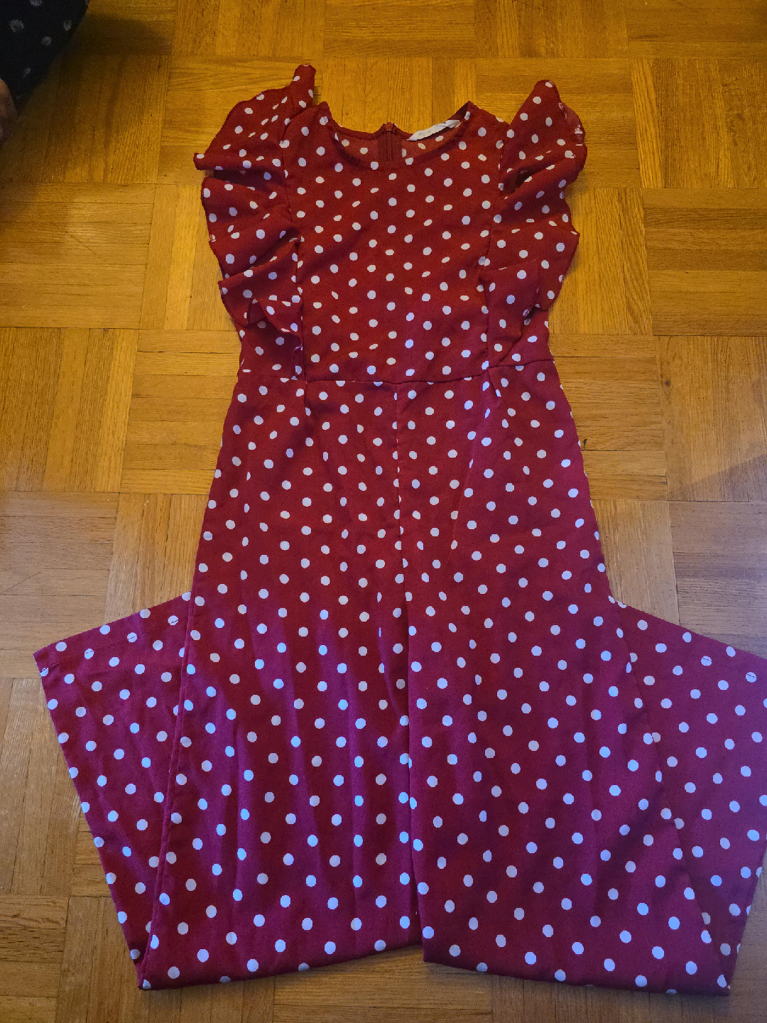Here's a cute red jumpsuit with white polka dots! It features a ruffled sleeve and a wide-leg cut. Perfect for a fun, casual look!