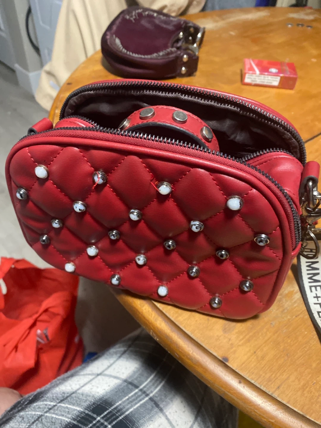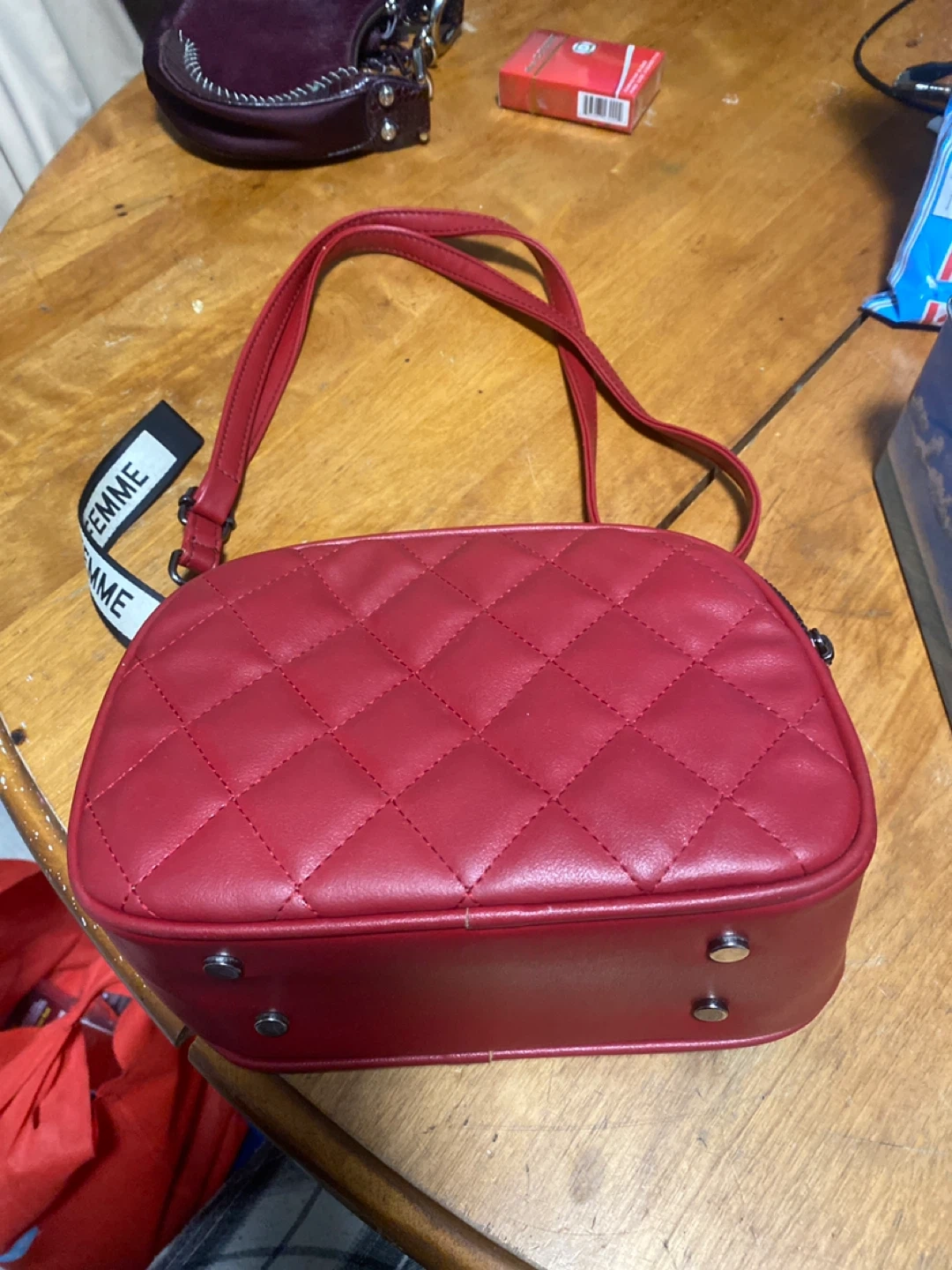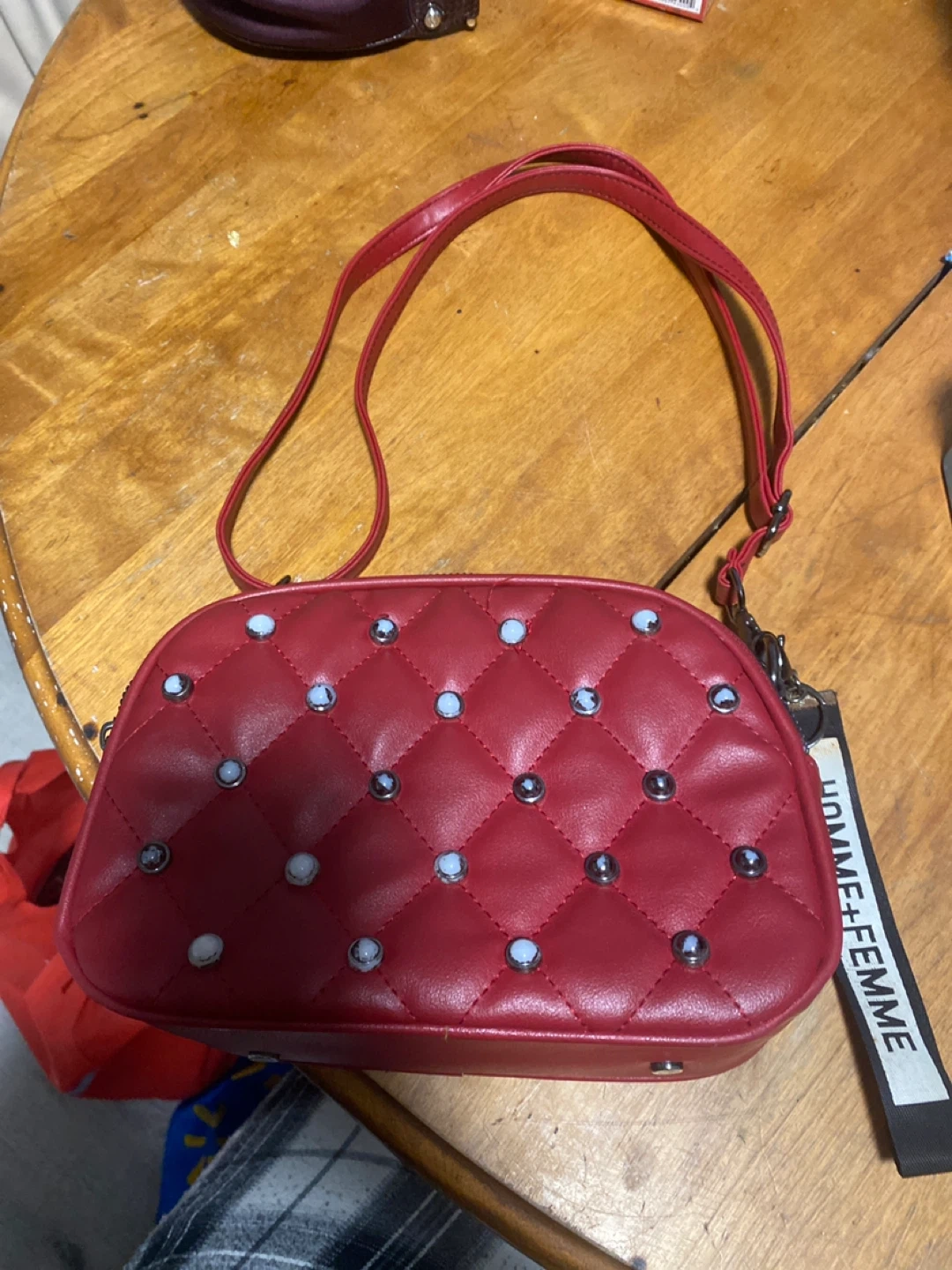 Cute red quilted shoulder bag with studded accents! It's in good condition and ready for a new home. Perfect for adding a pop of colour to any outfit! 105$ value want it gone