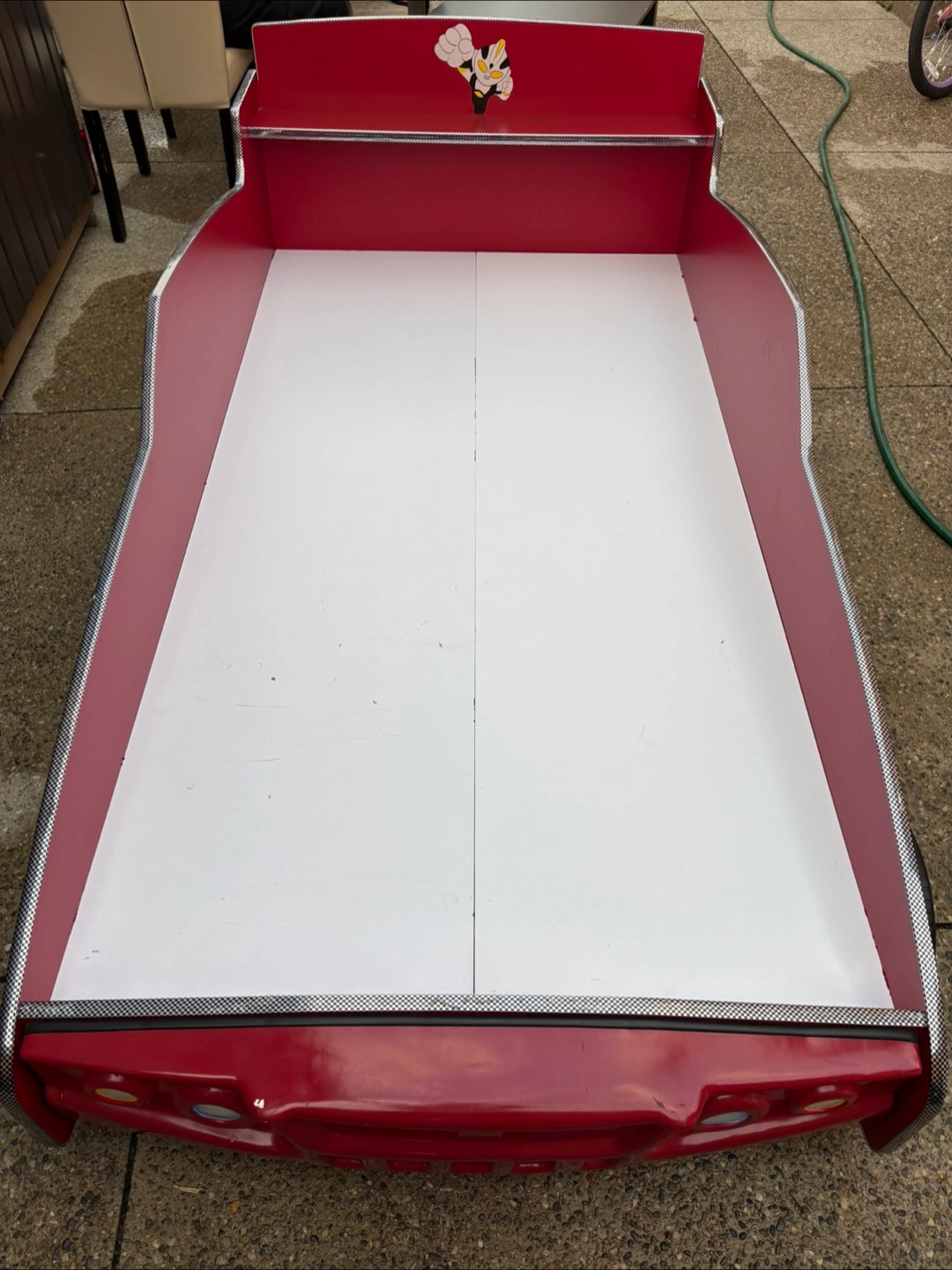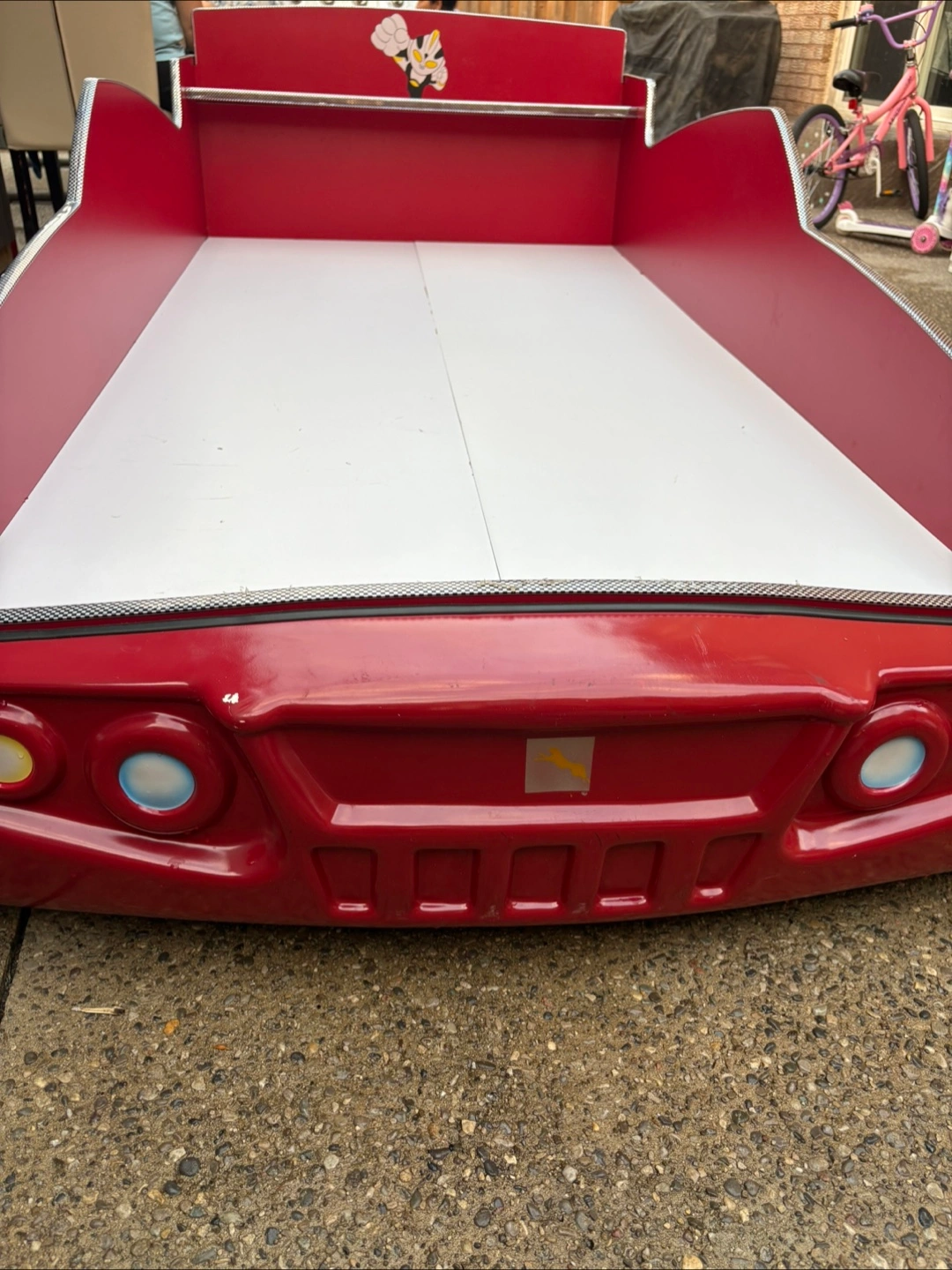 Selling a toddler-sized race car bed! It's red and white and would be perfect for a kiddo who loves cars. It has cool details like headlights and a spoiler. Ready for a new home!