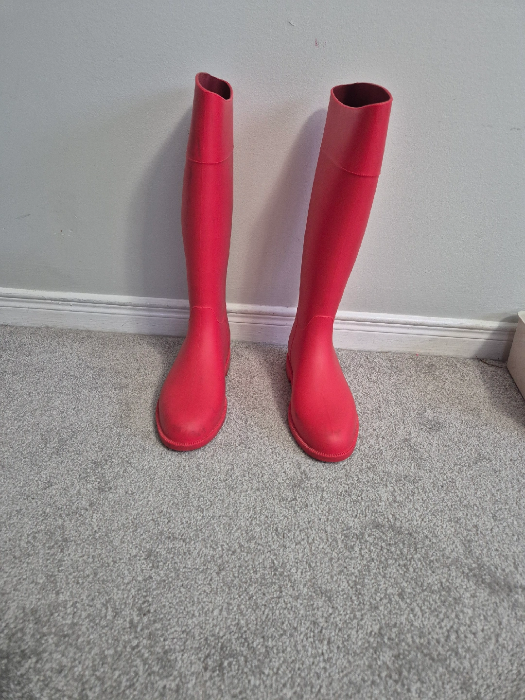 Red rain boots in great condition! Perfect for rainy days or gardening. They're very comfortable and easy to clean. Size not marked.