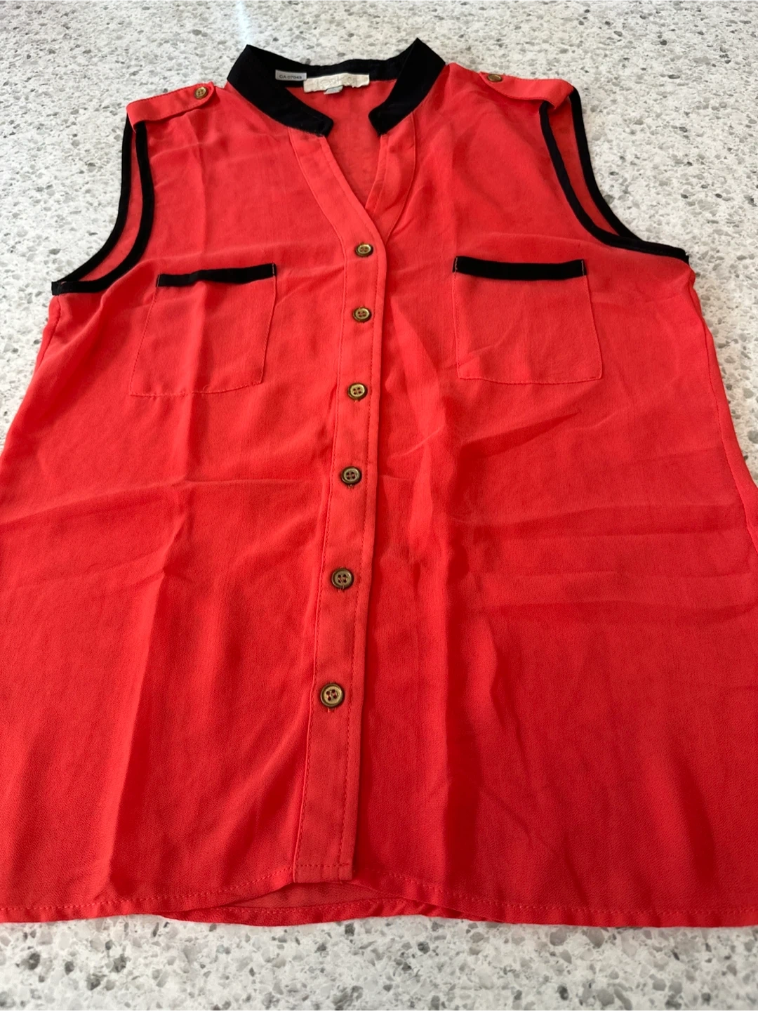 Here's a cute red sleeveless blouse from Toska. It's a size small and features black detailing around the collar, armholes, and pockets. It's in great condition and ready for a new home!