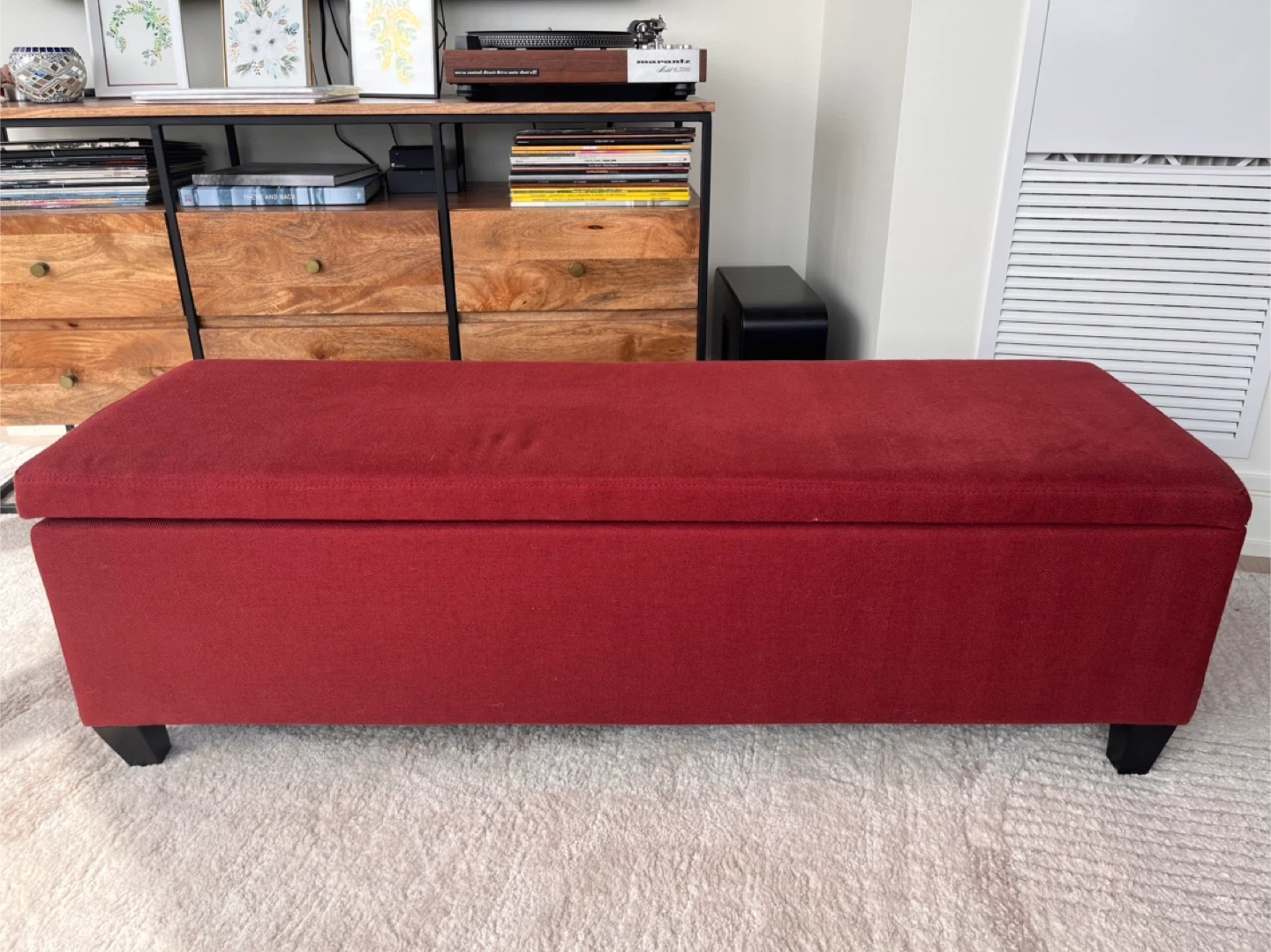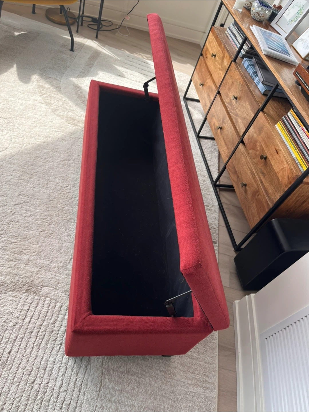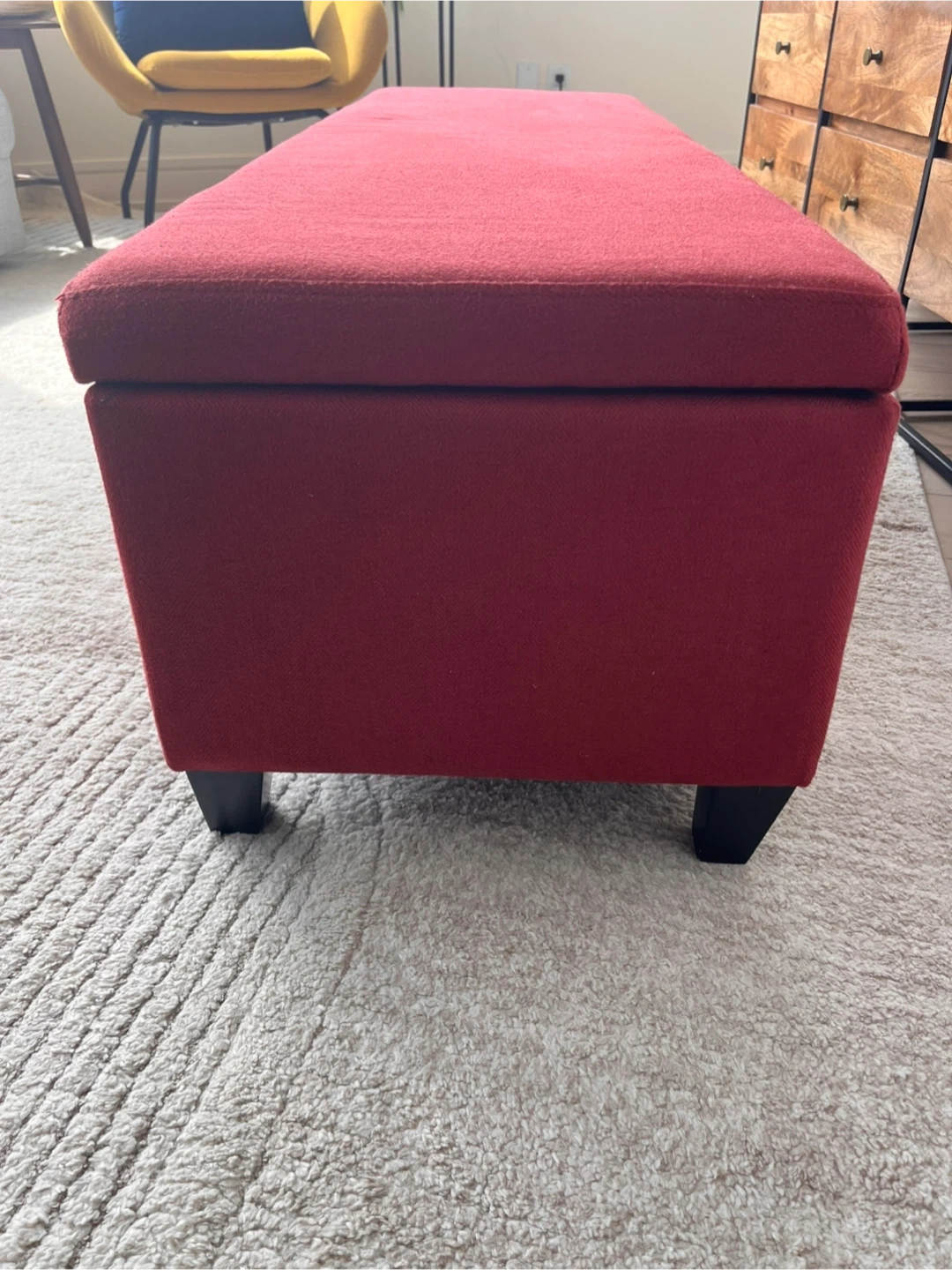 This red storage ottoman bench is perfect for adding extra seating and storage to any room! The interior is spacious and great for storing blankets, pillows, or anything else you need to tuck away. The top is cushioned, making it a comfortable place to sit. The ottoman is in great condition. Animal free home
