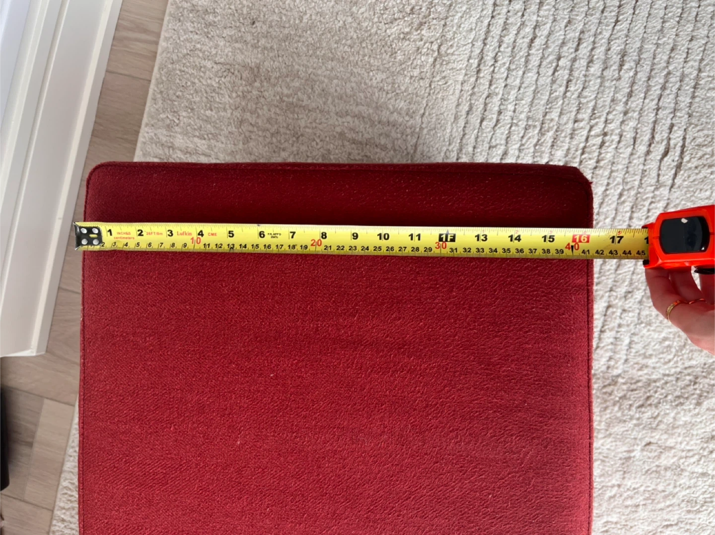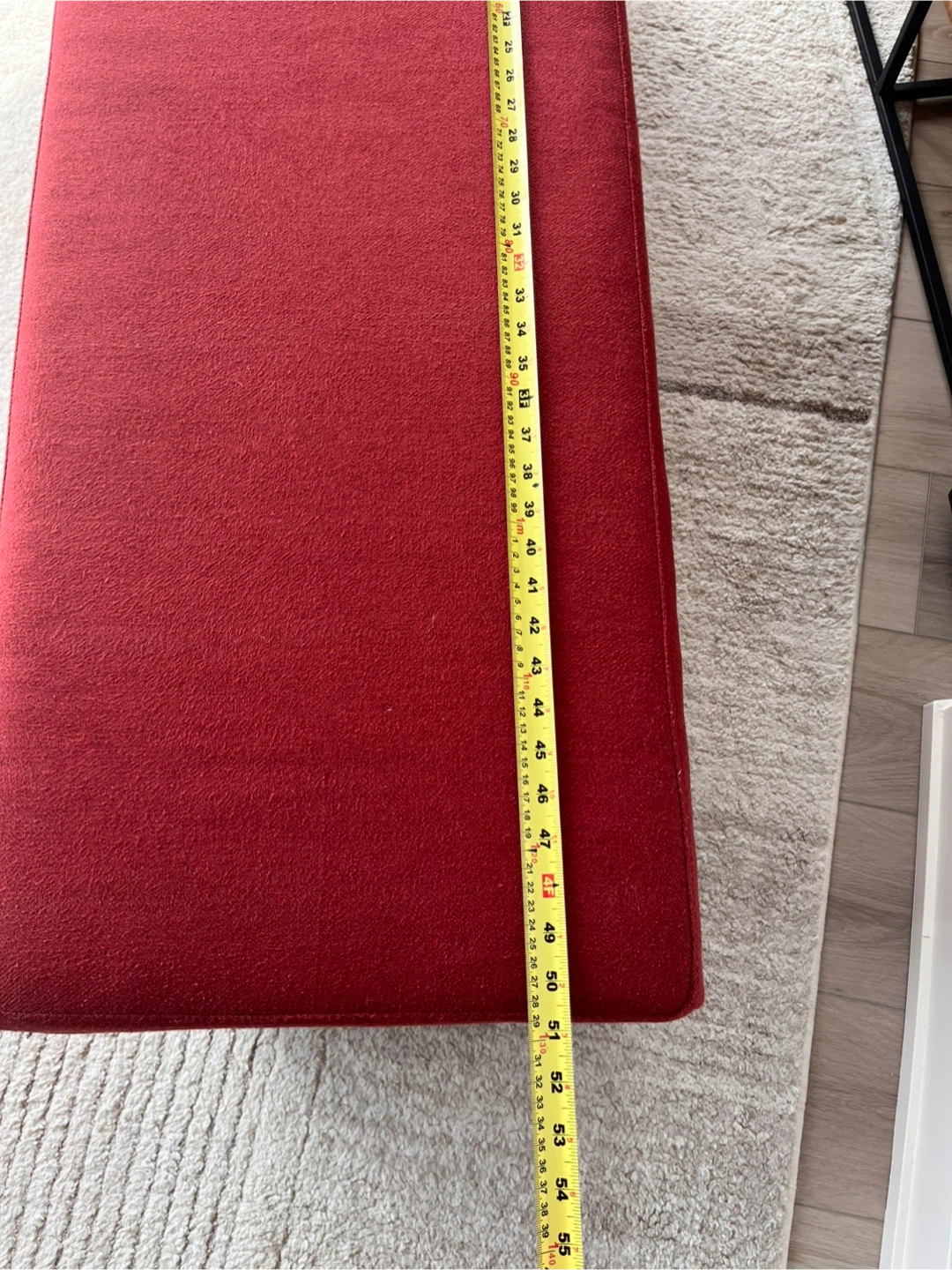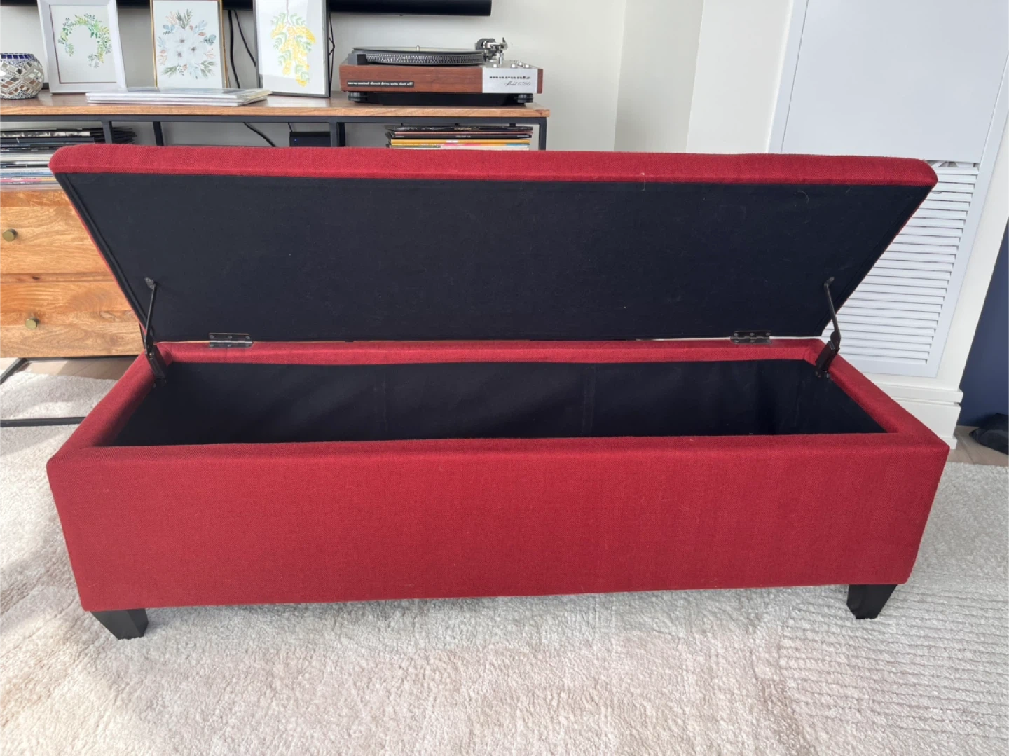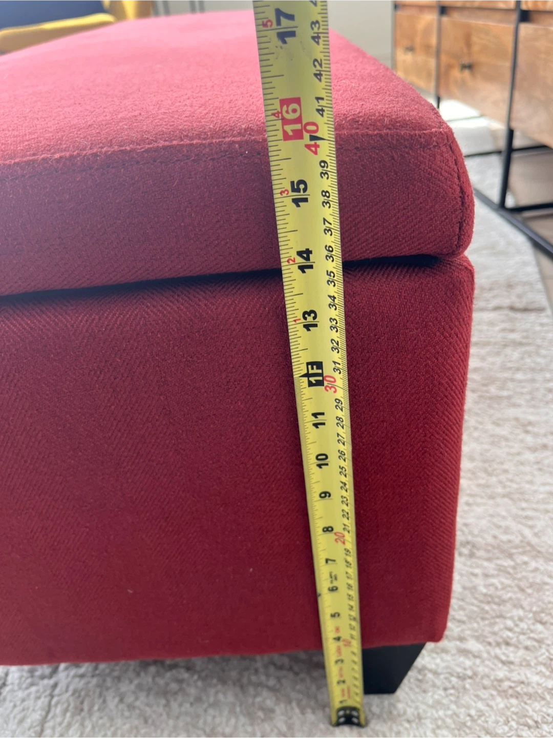 This red storage ottoman bench is perfect for adding extra seating and storage to any room! The interior is spacious and great for storing blankets, pillows, or anything else you need to tuck away. The top is cushioned, making it a comfortable place to sit. The ottoman is in great condition. Animal free home