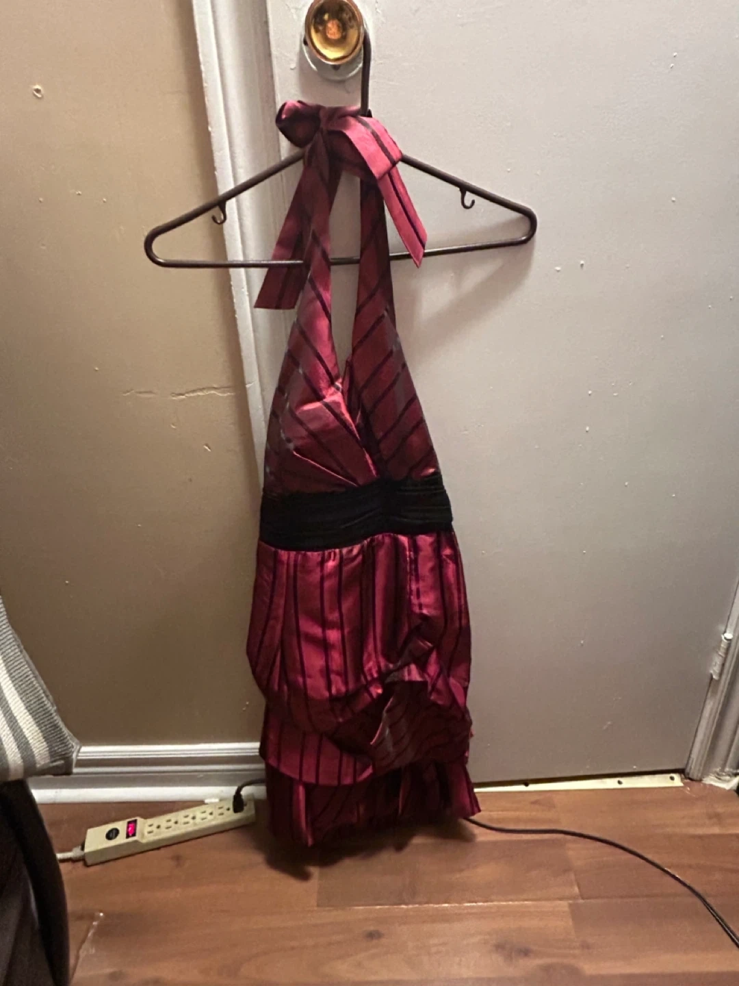 Selling a cute red and black striped halter dress! It features a tie at the neck and a tiered skirt. Perfect for a night out or a special occasion