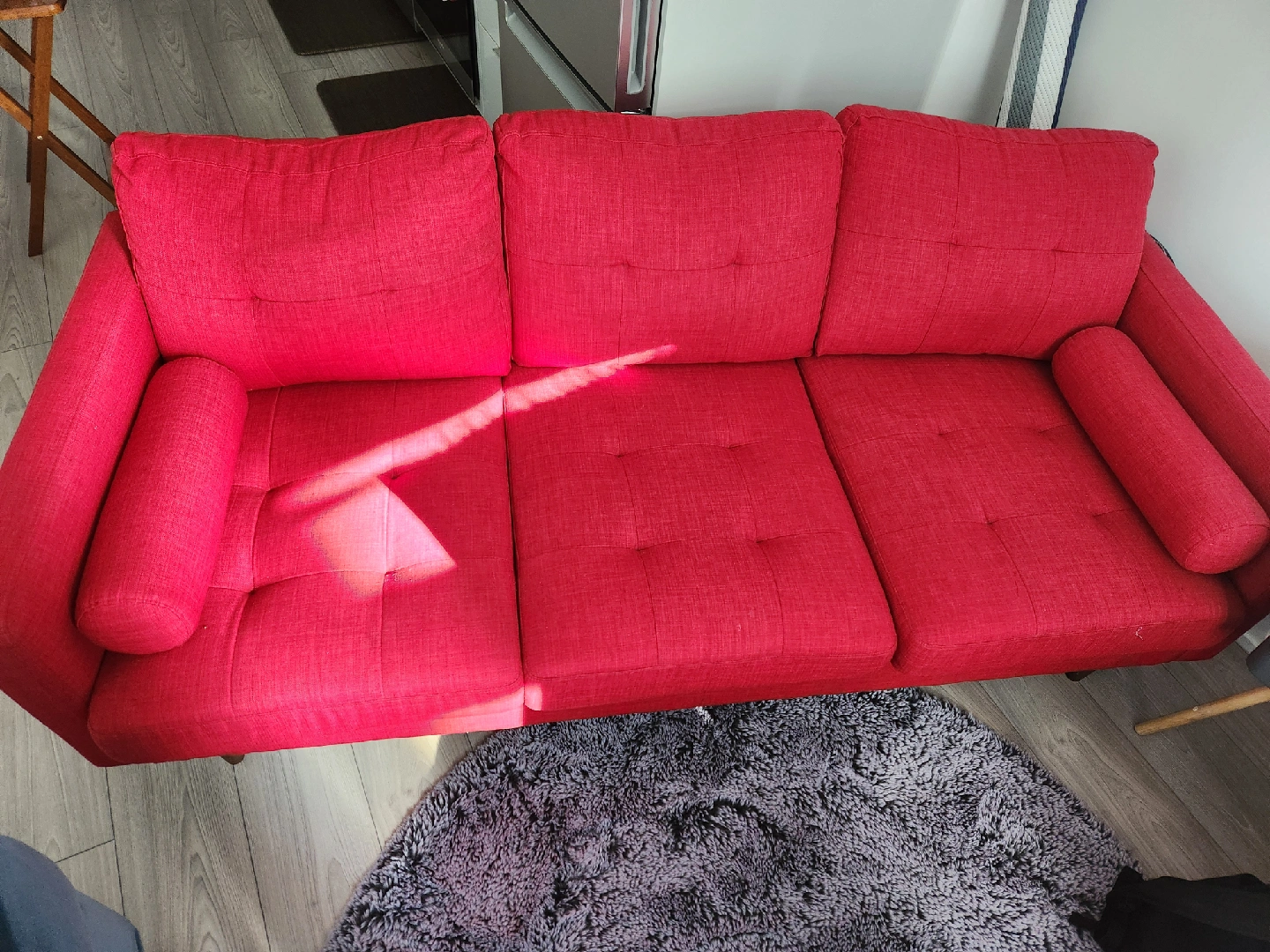 Selling a vibrant red three-seat sofa! It's in great shape and would add a pop of colour to any living space. Perfect for lounging and relaxing after a long day. It's a comfortable and stylish addition to any home!