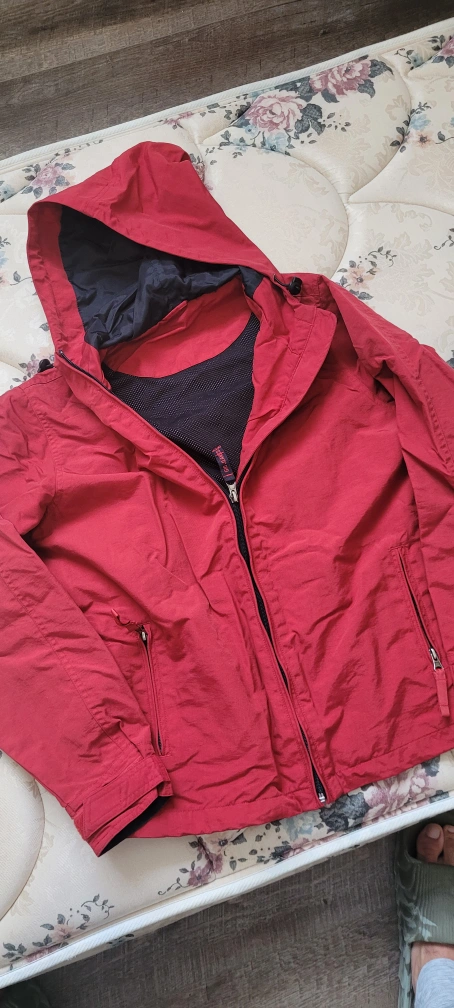 Red windbreaker jacket with a hood. Has a zipper and two pockets on the front. Has a mesh lining. Great against for the winter wind. ๐ can deliver within London for 5 CAD.