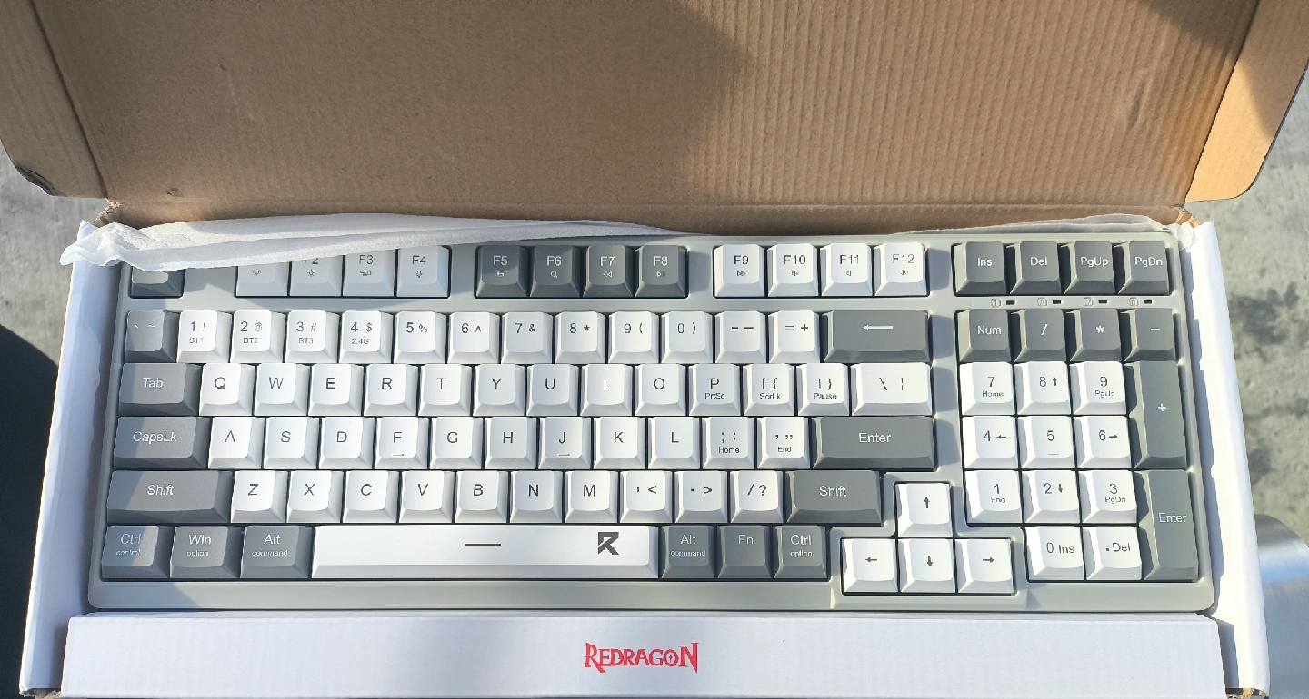 Selling a Redragon K617 Fizz Pro wireless mechanical keyboard in grey and white. It features a 98-key practical layout, 2.4G+BT wireless tech, and a scissor keystructure. Great condition and ready for a new home - Never Used