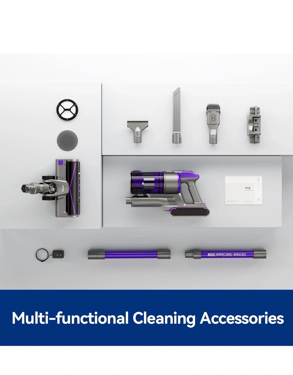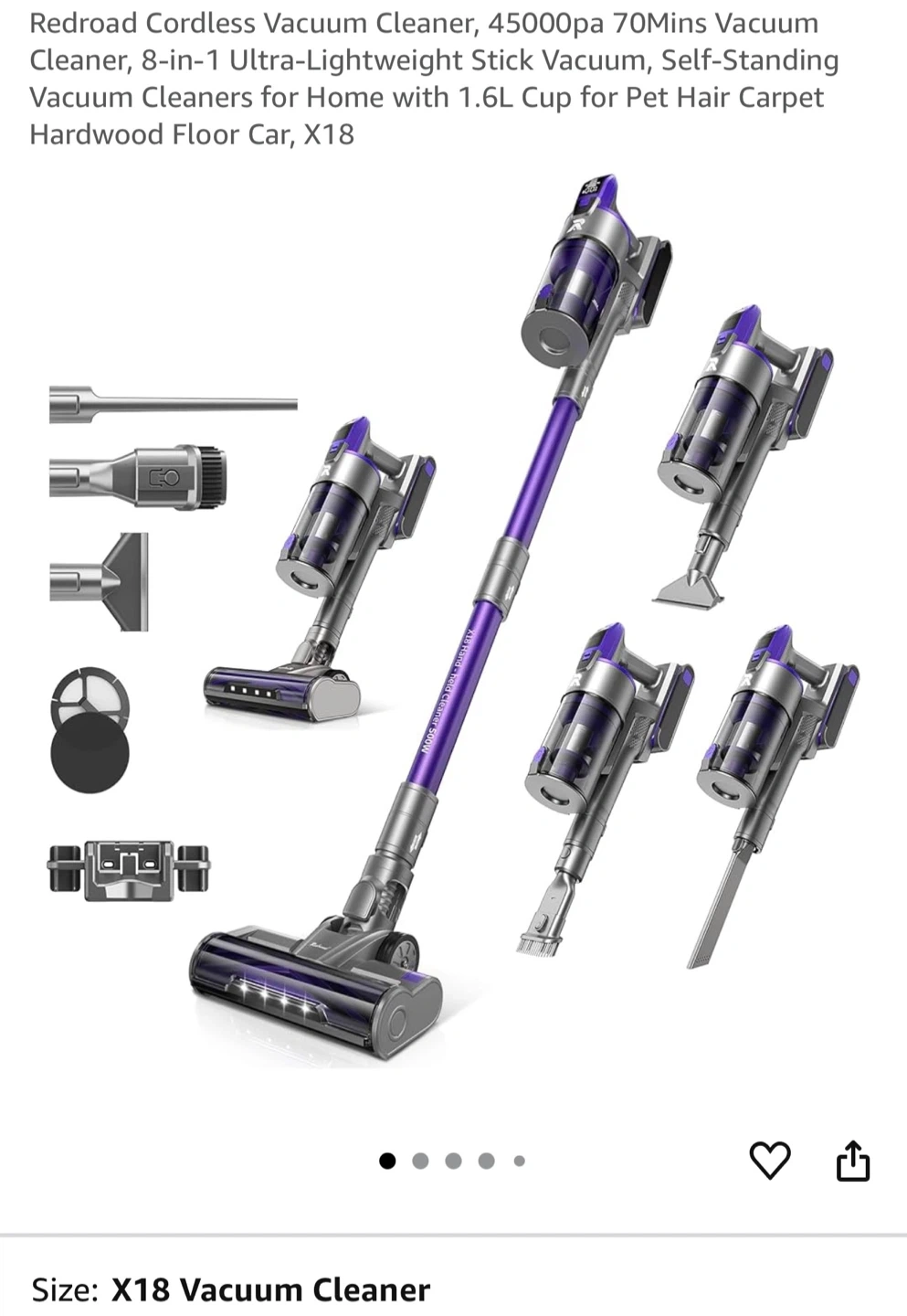 Selling a Redroad cordless vacuum cleaner, model X18! It's an 8-in-1 ultra-lightweight stick vacuum that's great for home use. It has a 1.6L cup, making it suitable for pet hair, carpets, and hardwood floors. It has a six-layer filter system and 99.99% filtration. The durable battery provides long-lasting suction power and has a 70-minute run time with 4-hour fast charging. It includes multiple accessories to help you clean every corner!