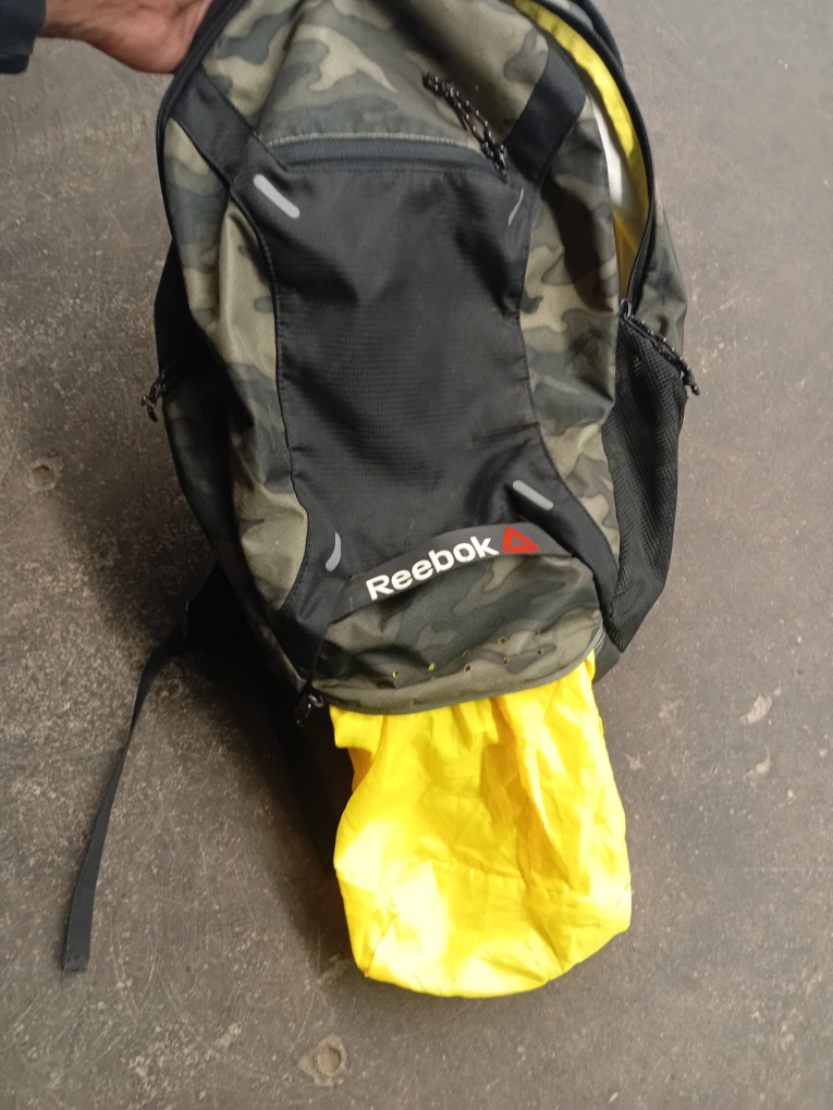 Here's a Reebok backpack featuring a cool camo pattern! It has black accents and a vibrant yellow interior. Perfect for school, sports, or everyday adventures