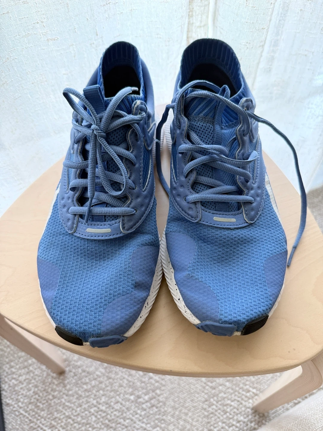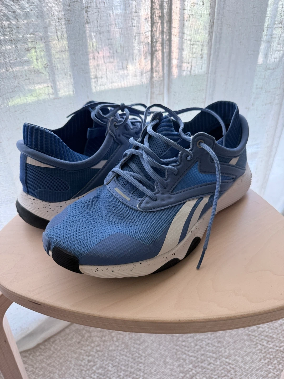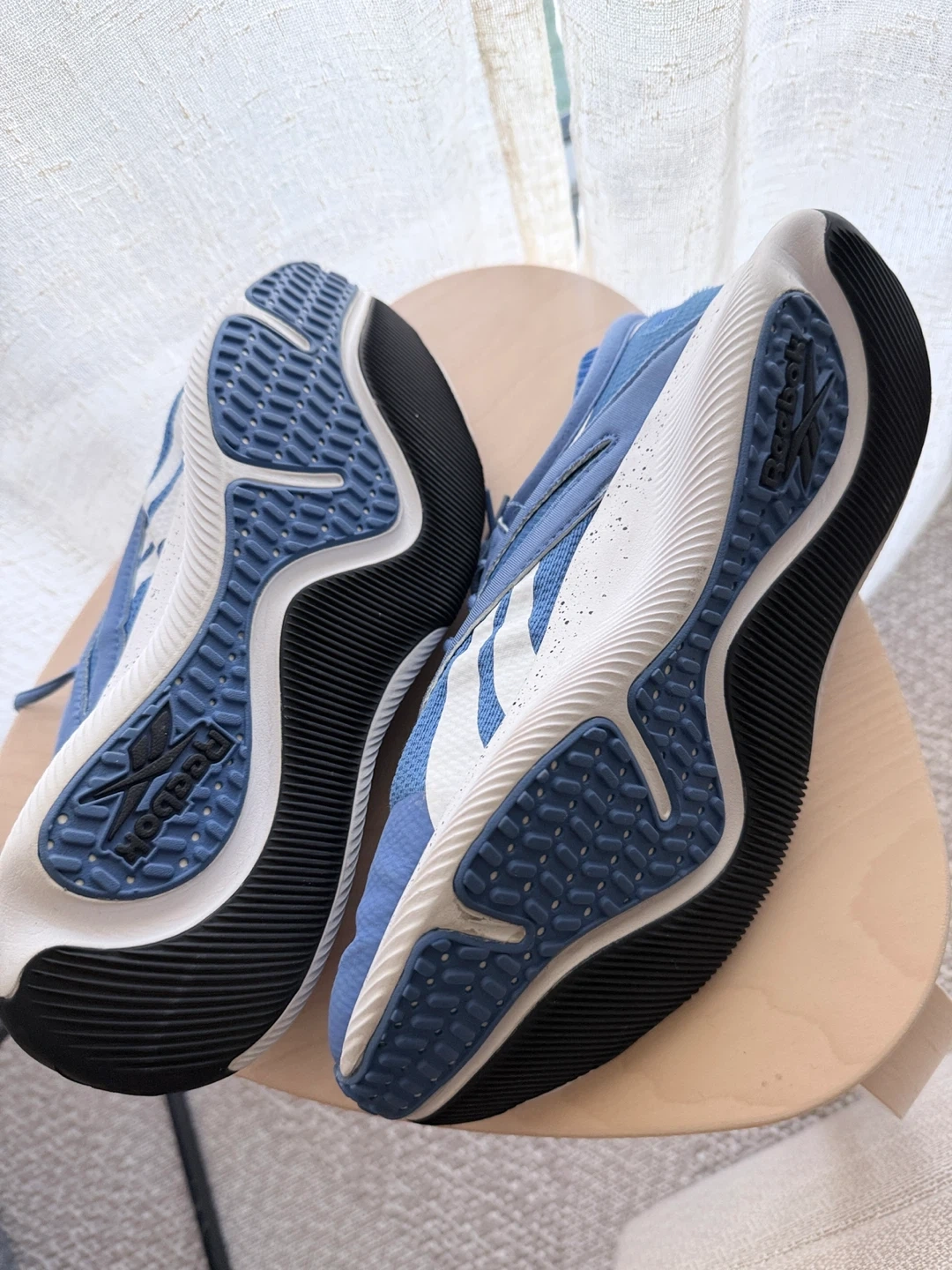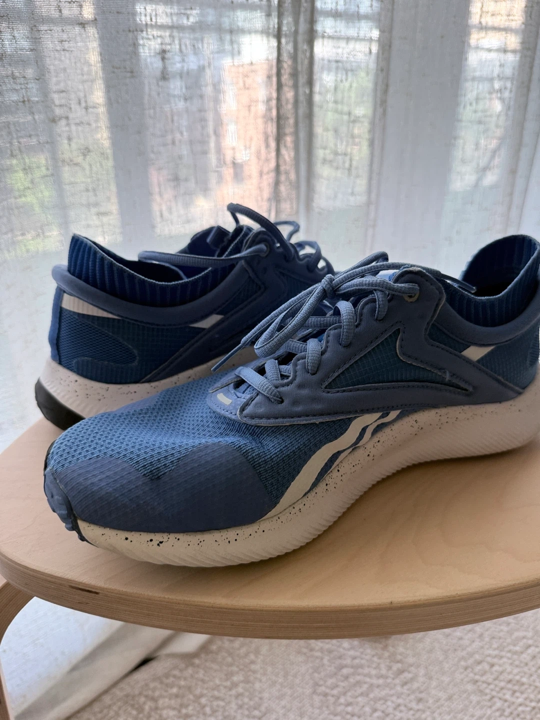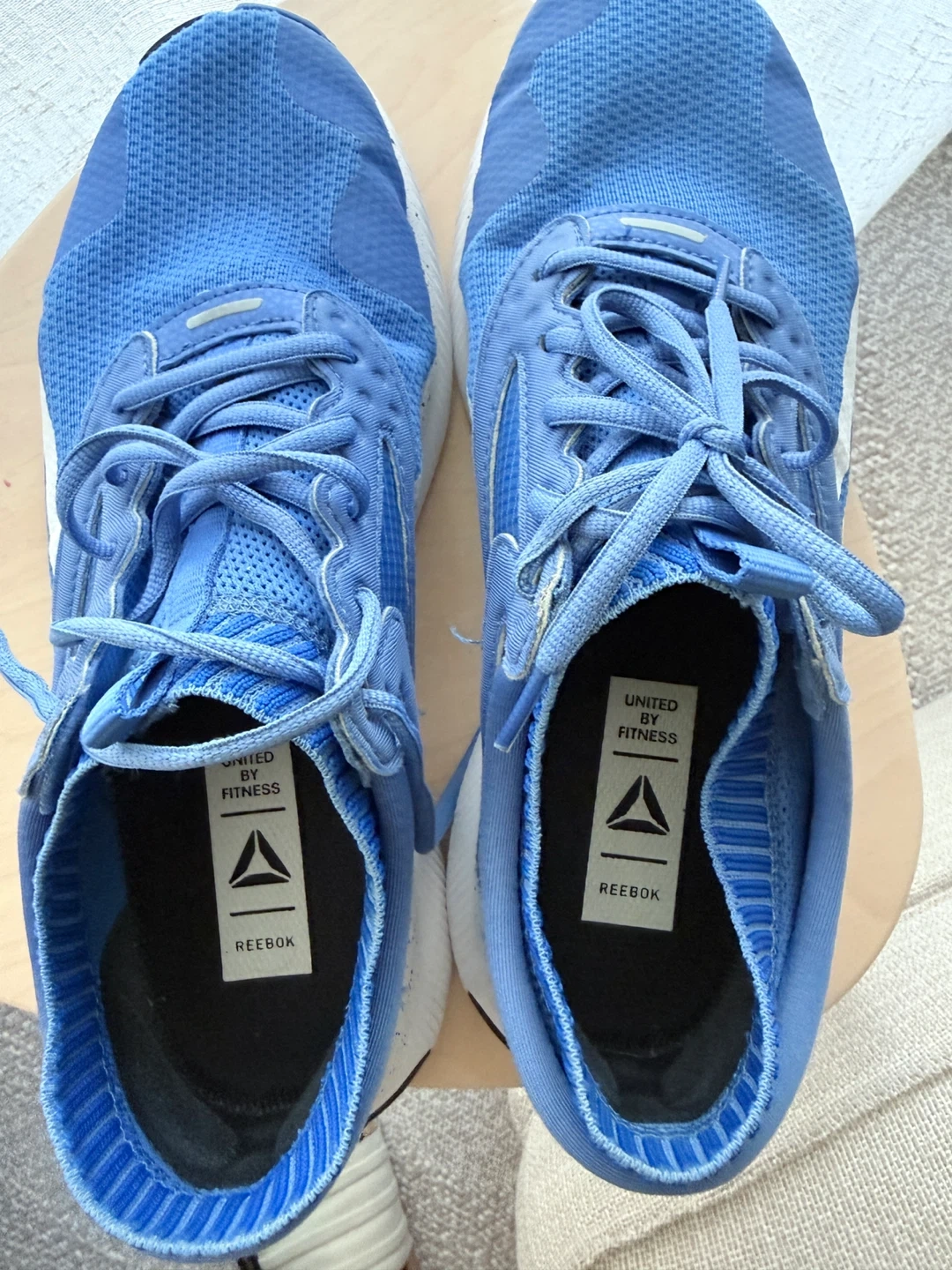 Selling a pair of blue Reebok running shoes. The size is US 9.5 which is approximately a US 12. They are in good condition and ready for your next run!