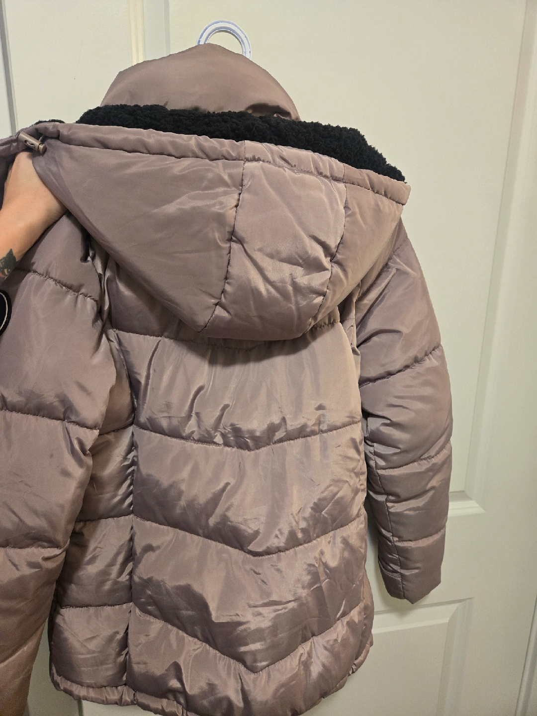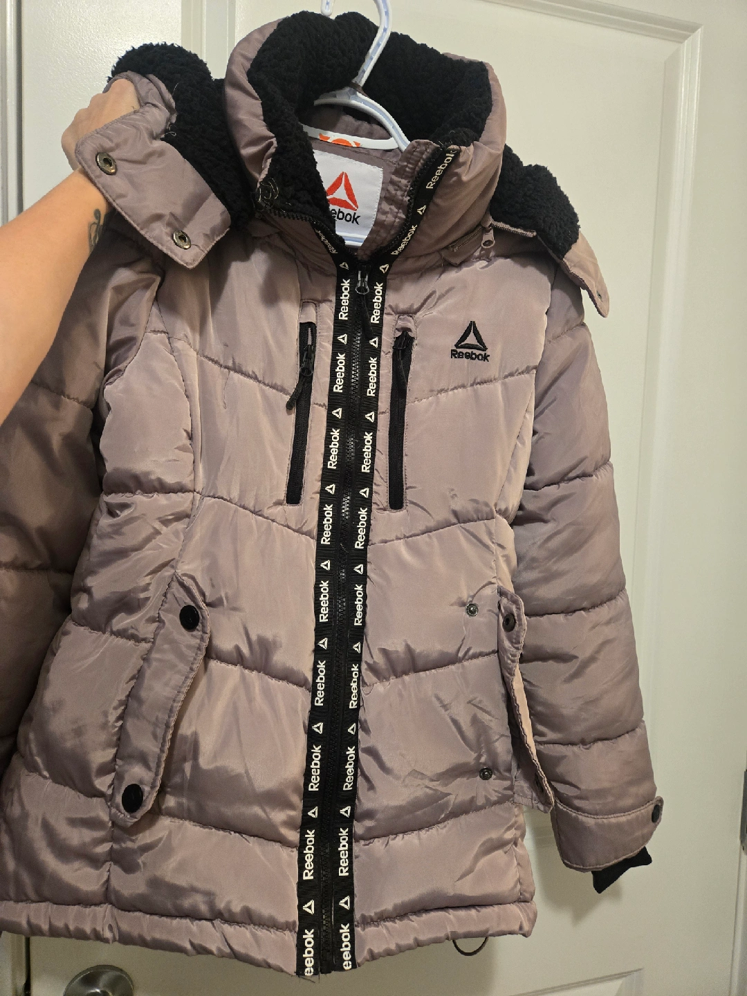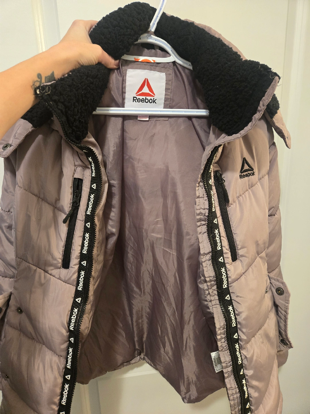 Selling a Reebok puffer jacket in great condition! It's a stylish and warm jacket, perfect for the colder weather. The jacket features a full zip with the Reebok logo along the zipper. It also has a hood with a cozy black lining. only wore cupple times