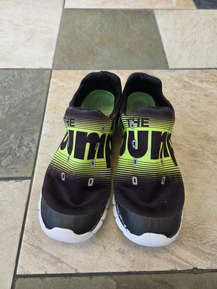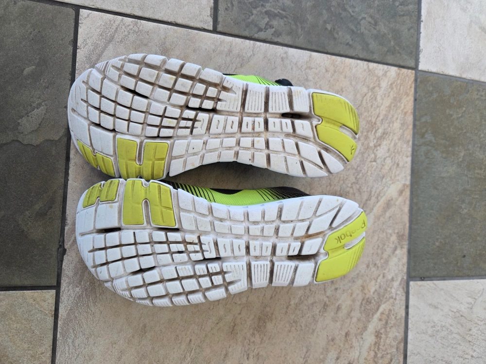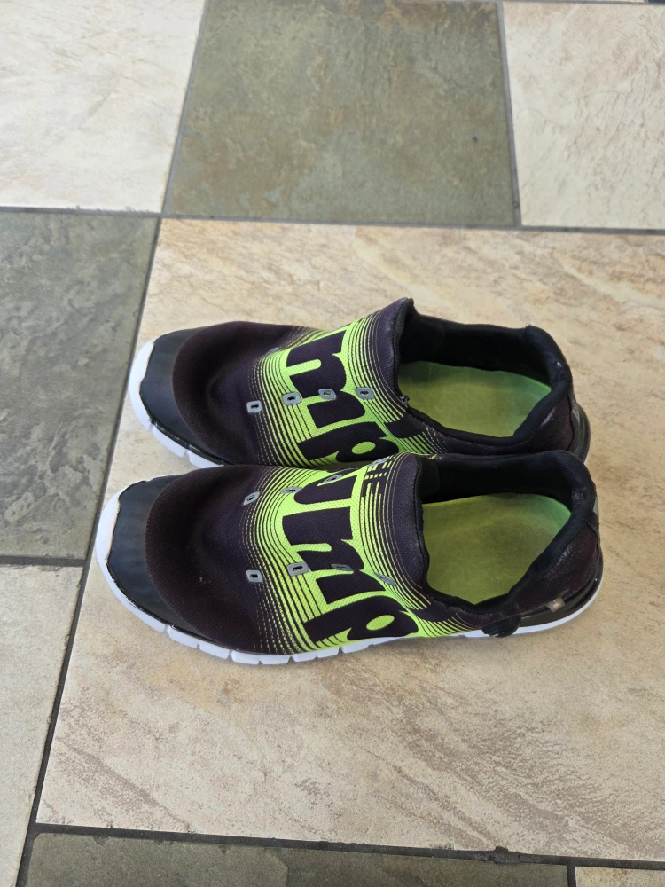 Selling a pair of Reebok Skyscape running shoes. They are black with a neon green design. The soles have a lot of life left in them and are ready for many more runs!