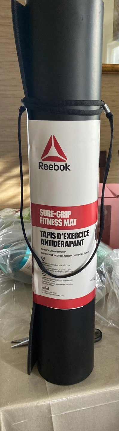 Black yoga mat with a carrying strap. Sweat-activated grip. Latex-free cushioned backing offers optimal support.