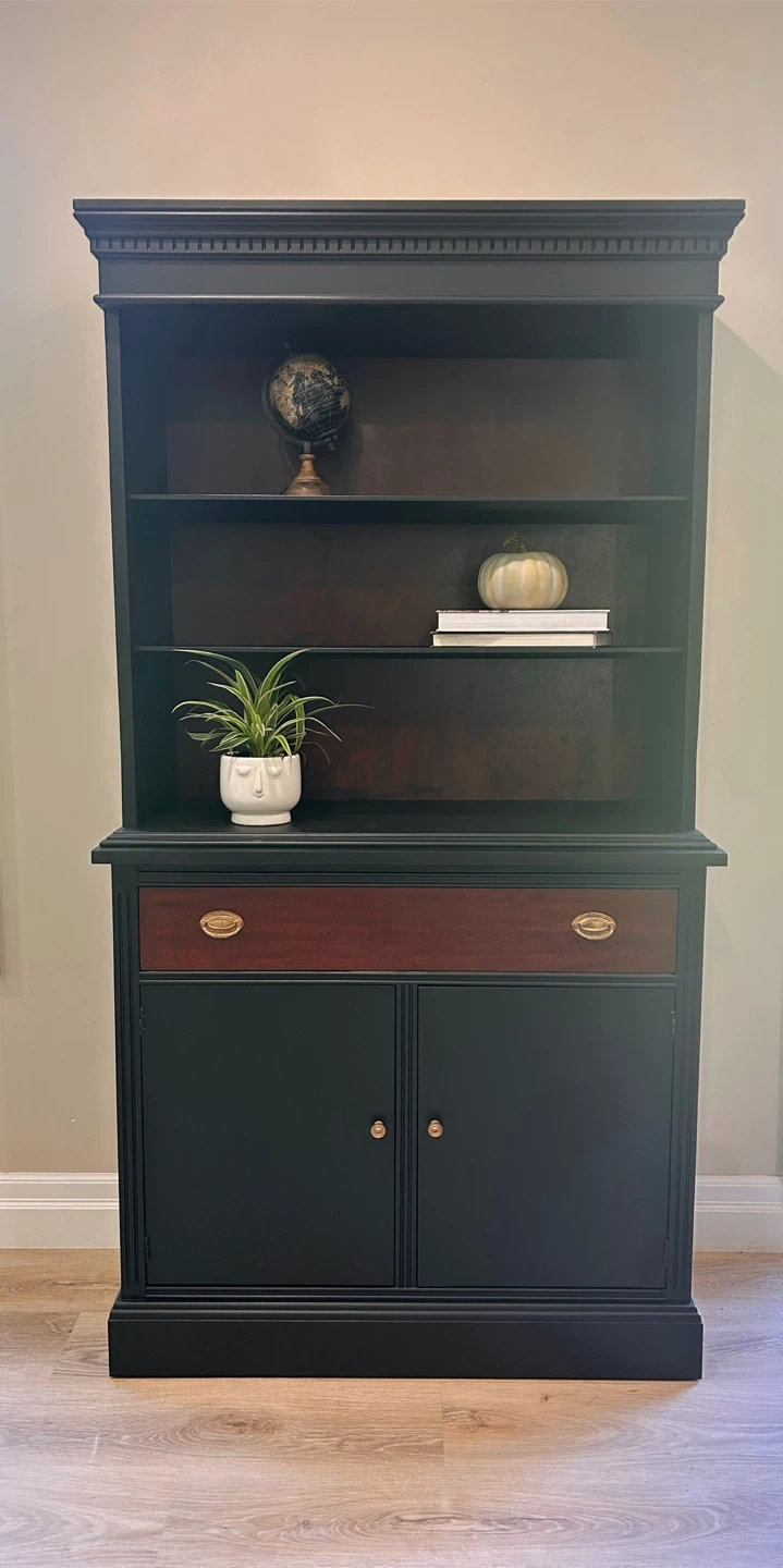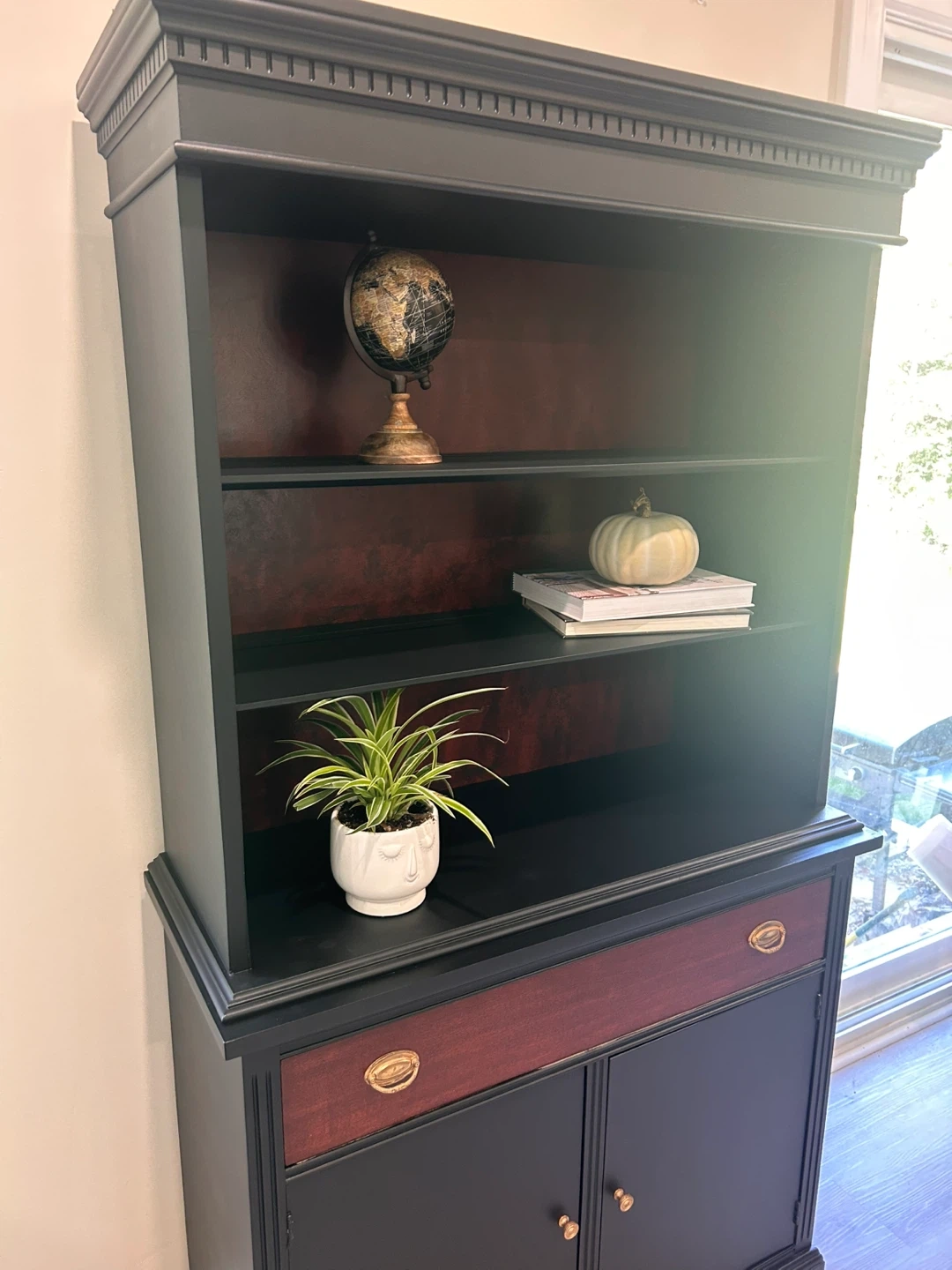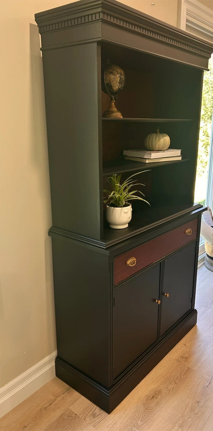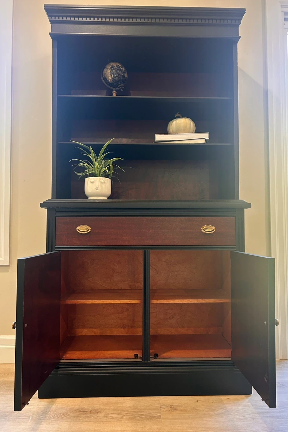 This beautiful hutch has been refinished in Fusion paint in the color coal black. Original hardware has been refreshed as well. This piece is in excellent condition. Dimensions Height 67.5” Width 36” Depth 15” Pick or local delivery available for a fee.